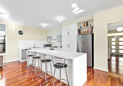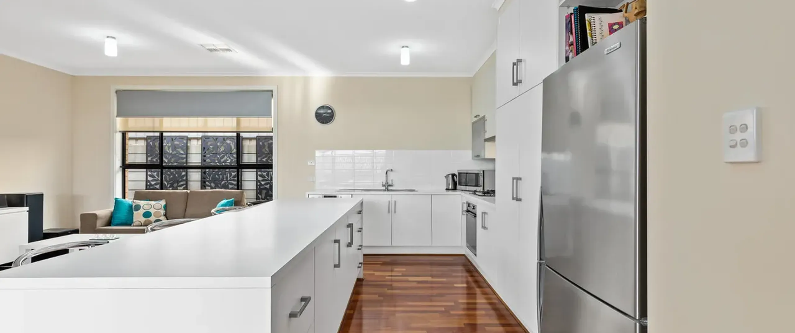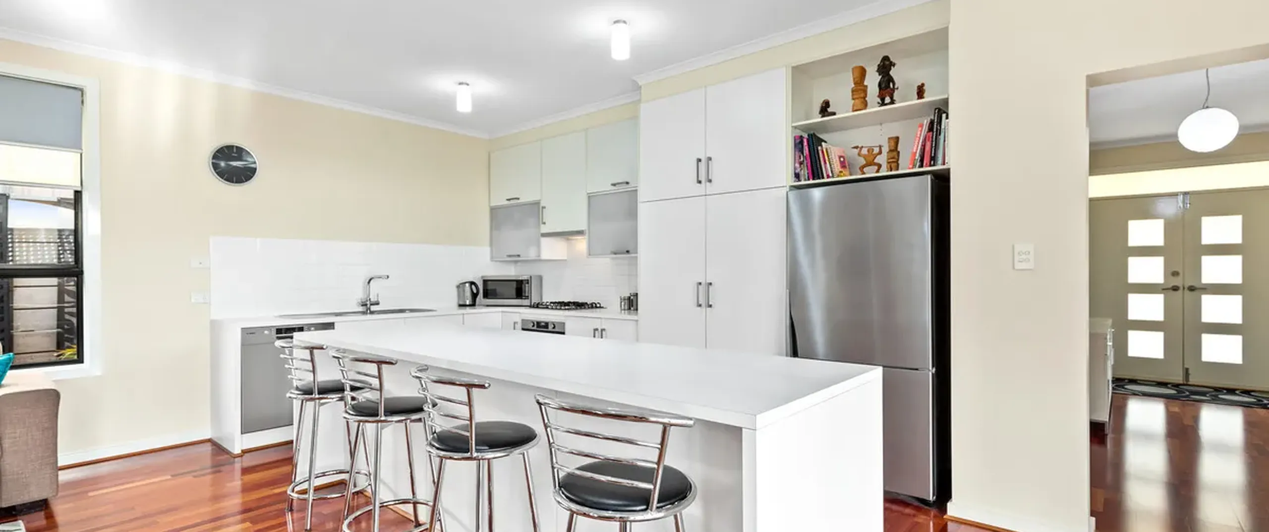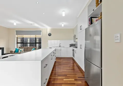 - Stylish white kitchen with gas cooktop, stainless steel oven and dishwasher, ample storage including pantry, complete island bench with breakfast bar