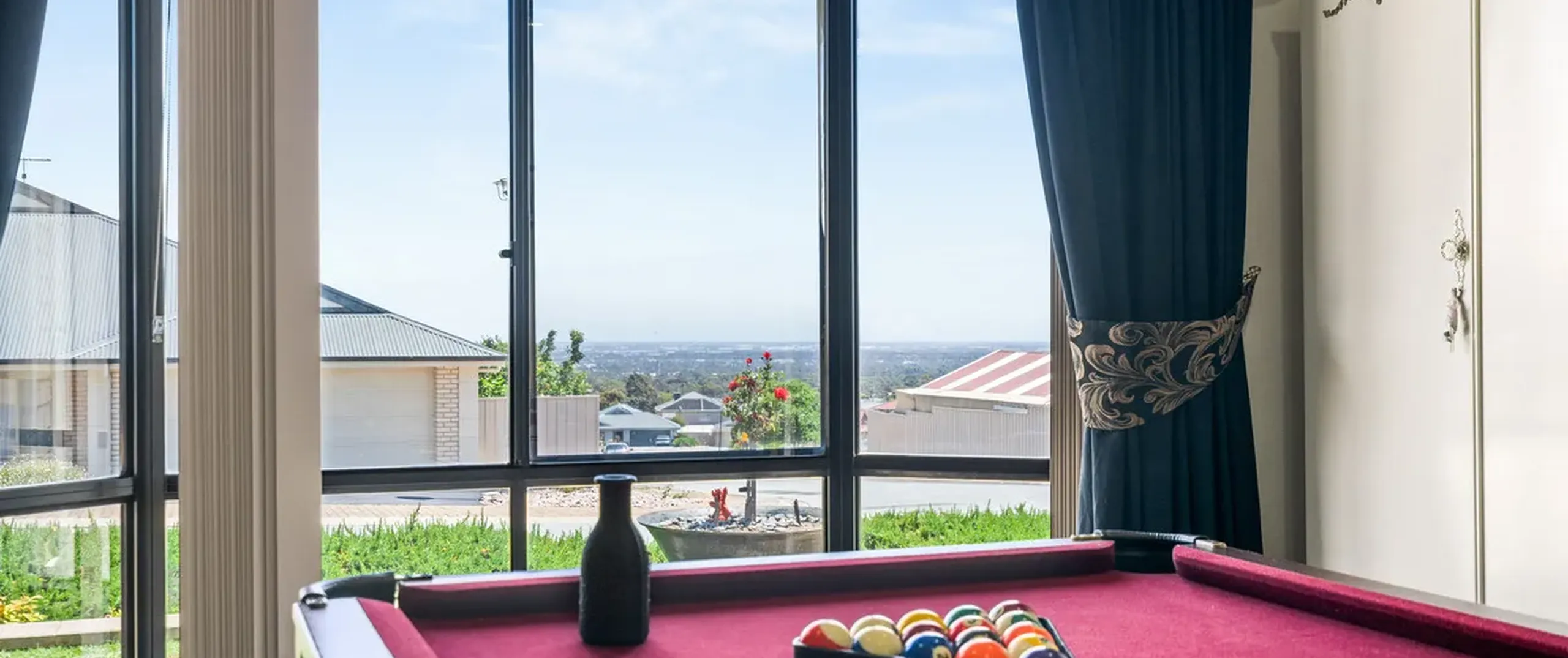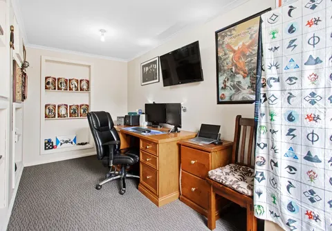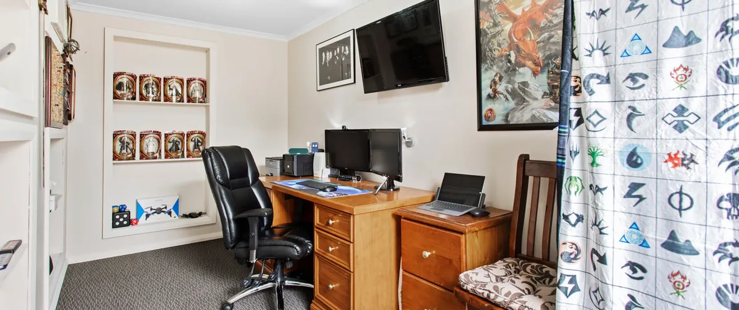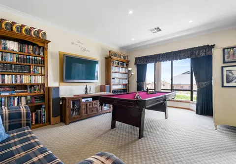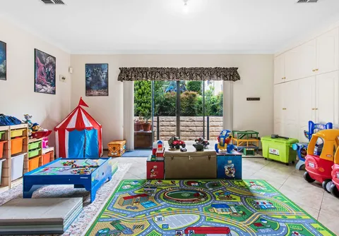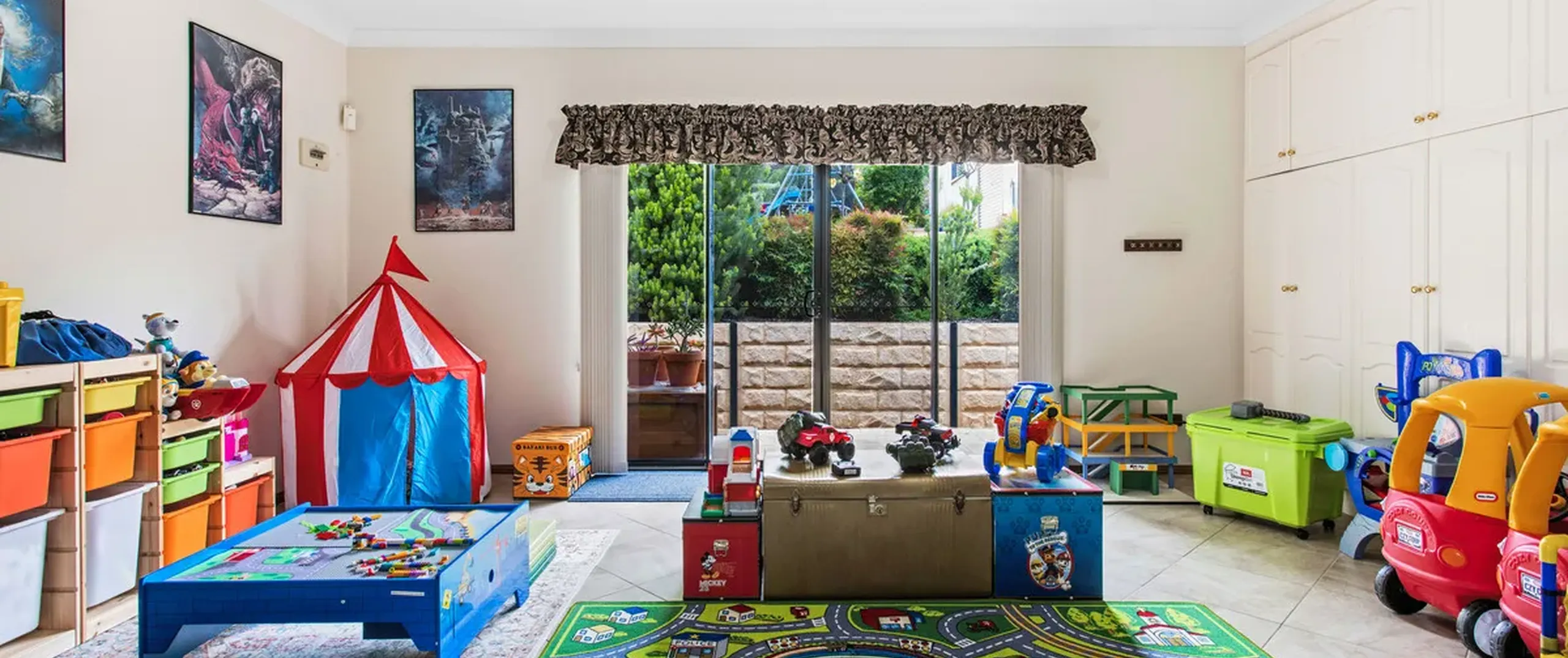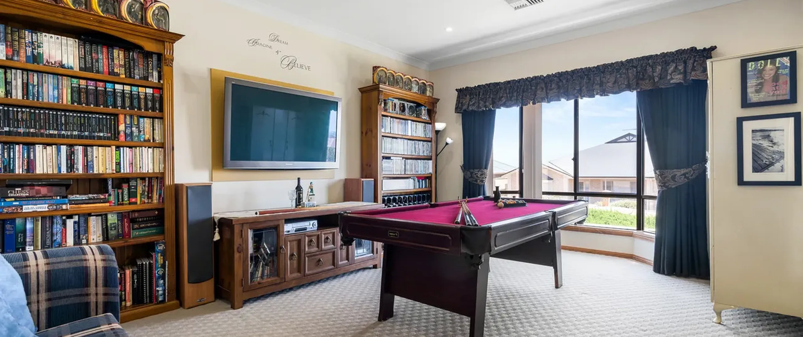 - Large games room with wall-length built-in cupboard storage and glass sliding doors opening to the backyard