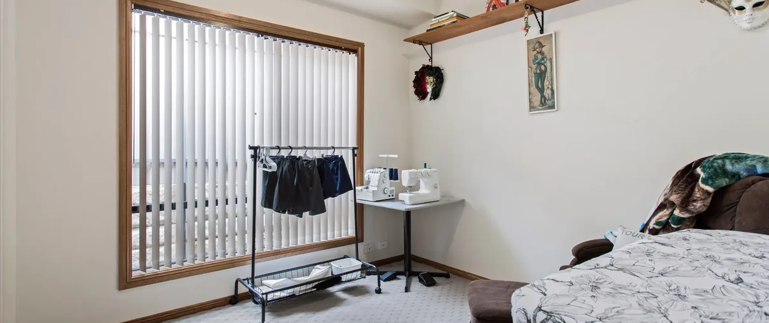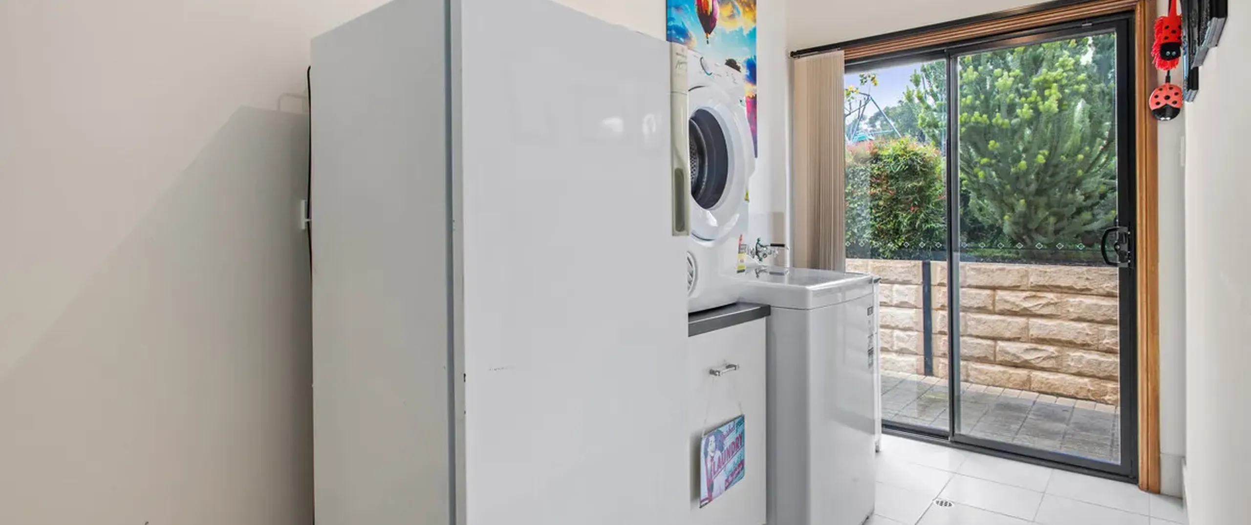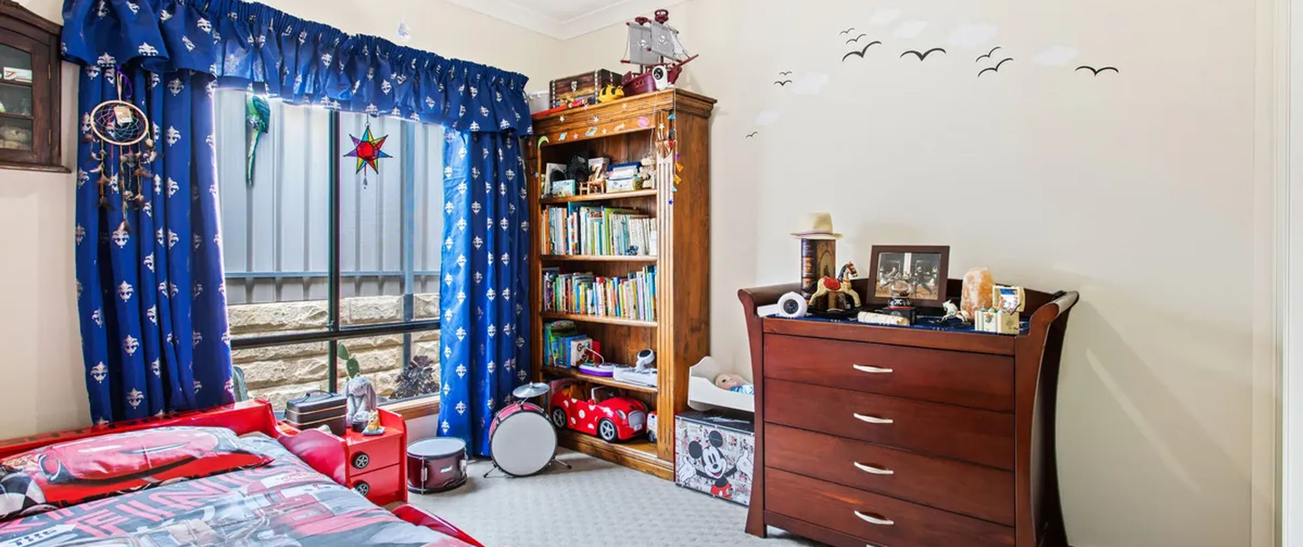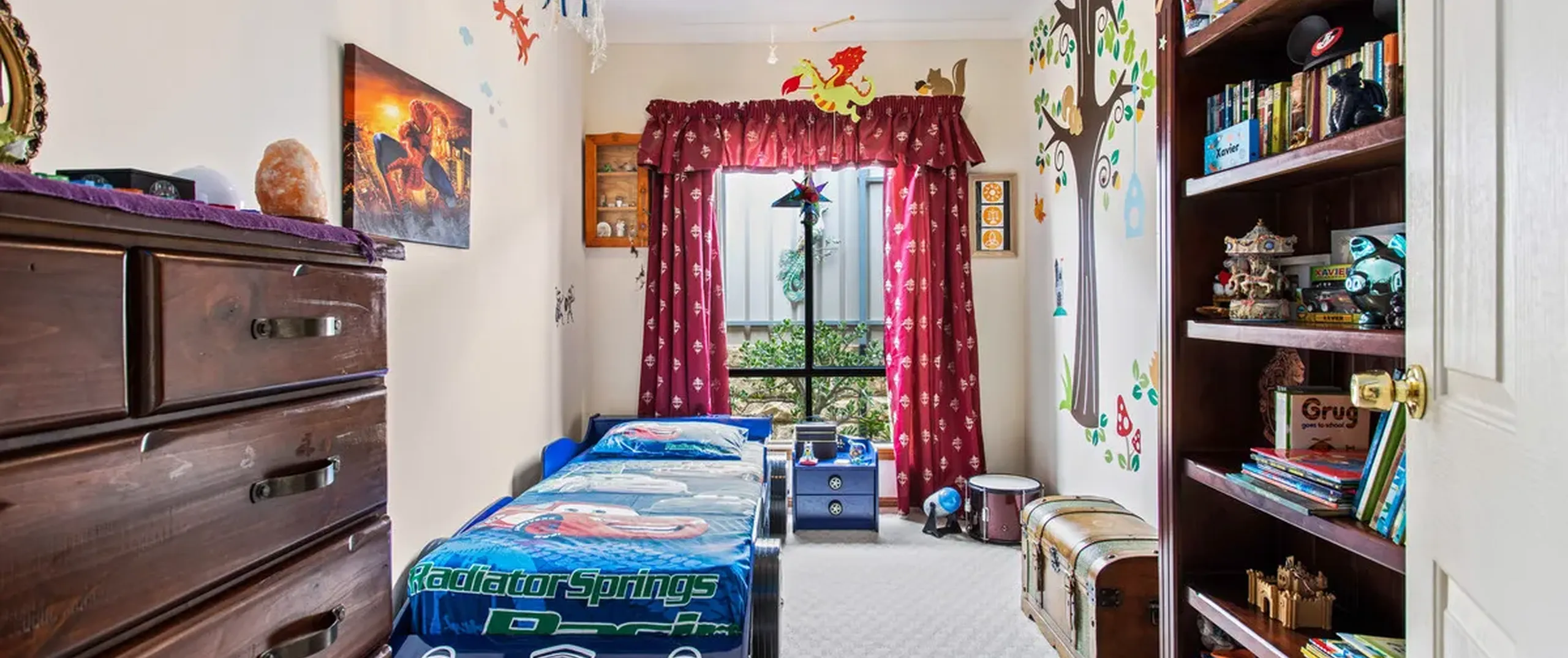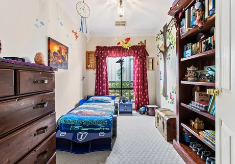 - Large games room with wall-length built-in cupboard storage and glass sliding doors opening to the backyard