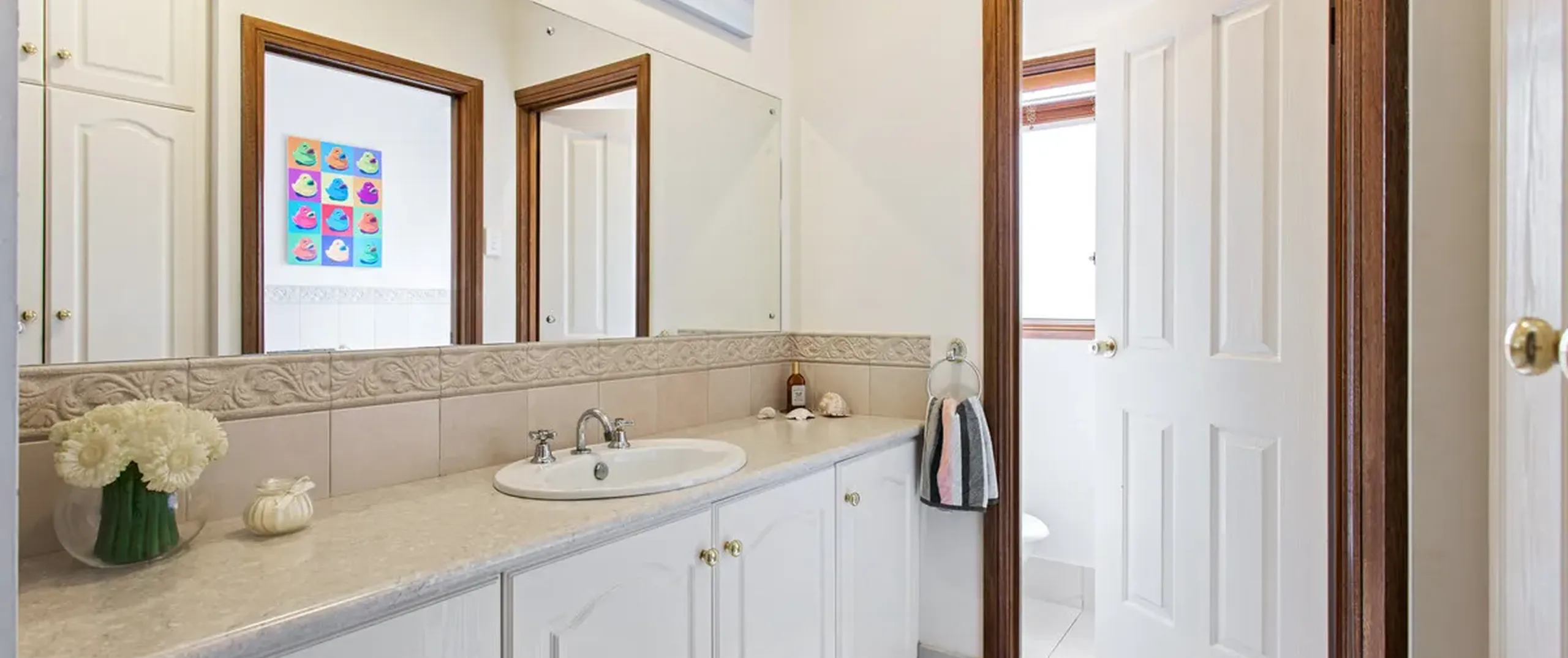 - Sparkling three-way bathroom with separate bath and shower + linen storage to the vanity area
