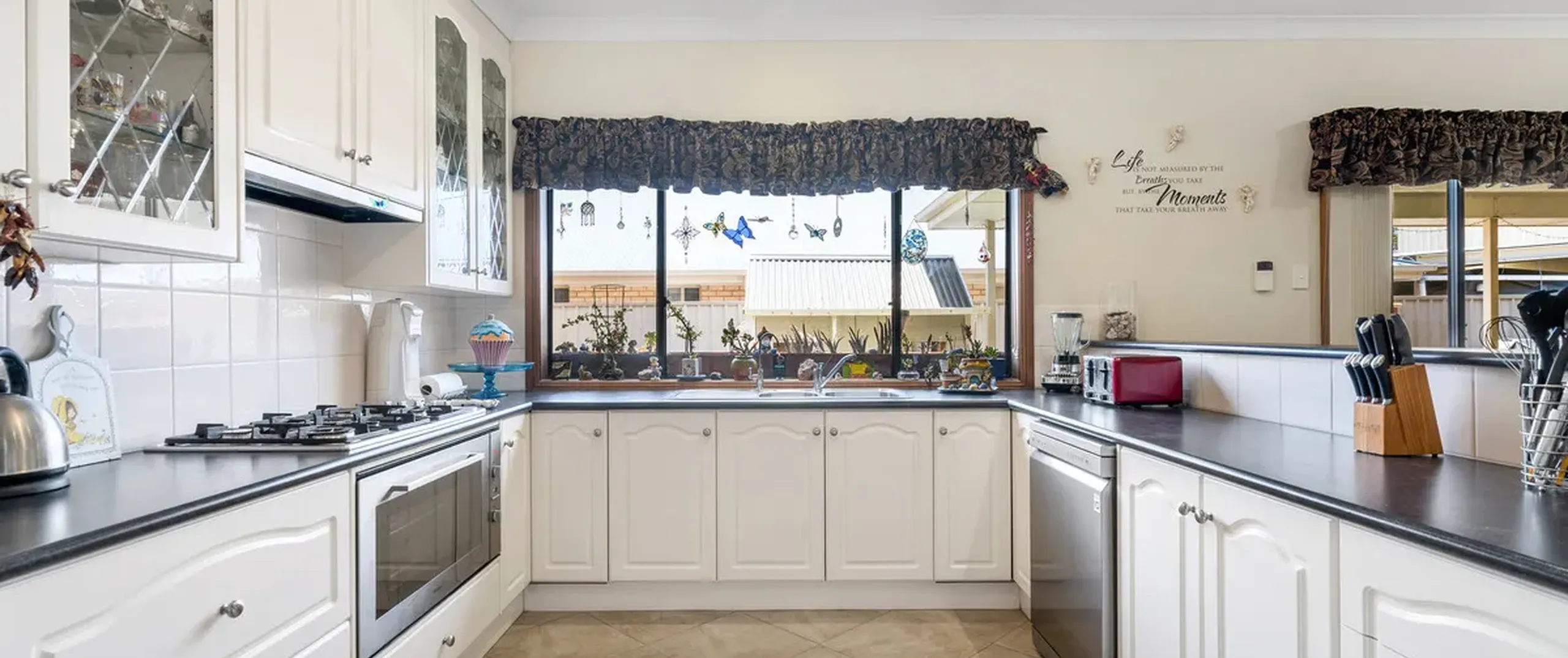 - Charming large kitchen boasting a suite of stainless-steel appliances including dishwasher, oven and gas cooktop, large pantry, ample cupboard space and sweeping benchtops