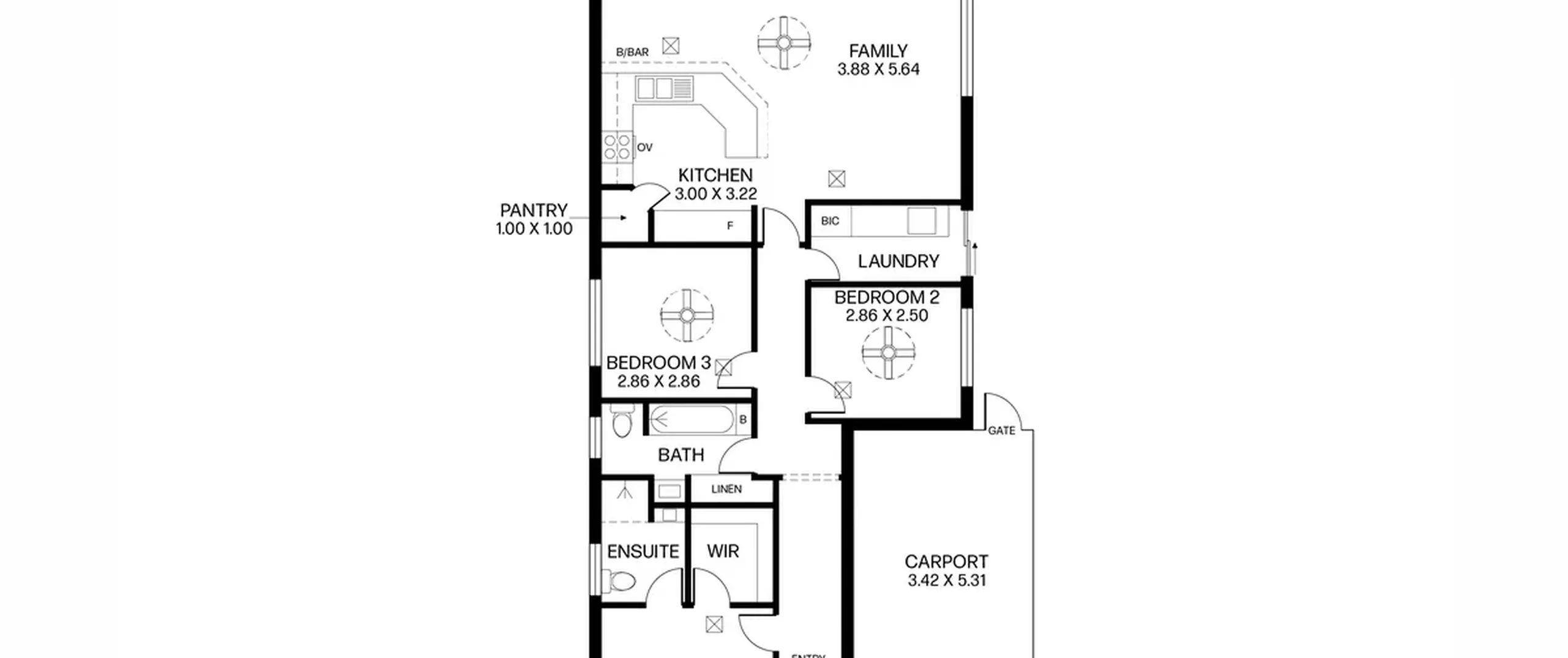 The sleek kitchen takes centre stage, boasting a quality stainless steel gas cooktop and oven, corner pantry and generous bench space. Flowing effortlessly into the dining and family zones with large format tiles and a ceiling fan, this area creates a warm and connected heart of the home.