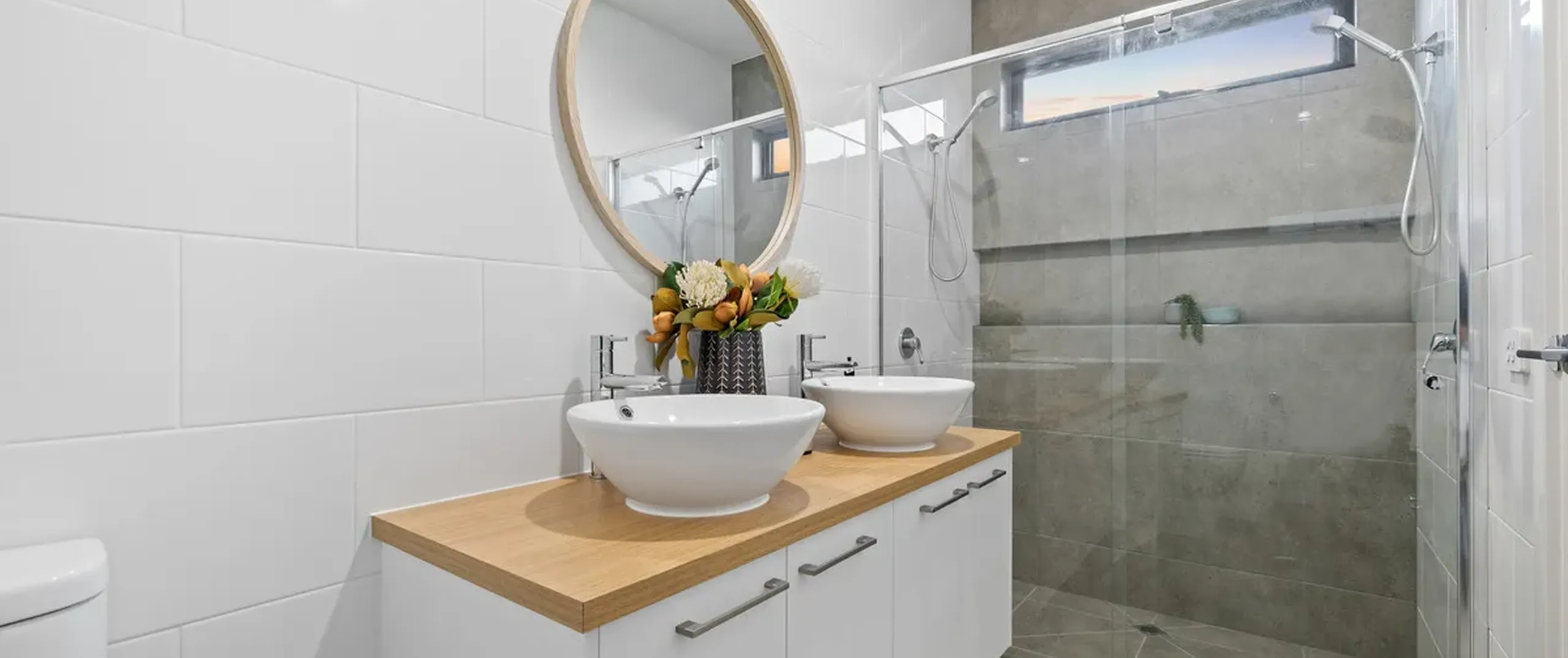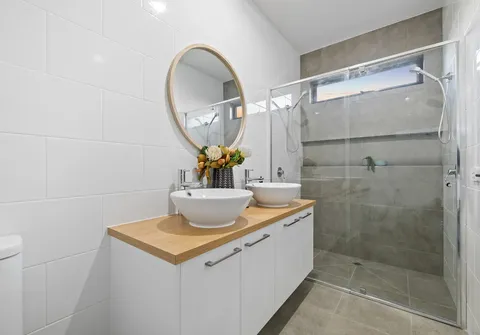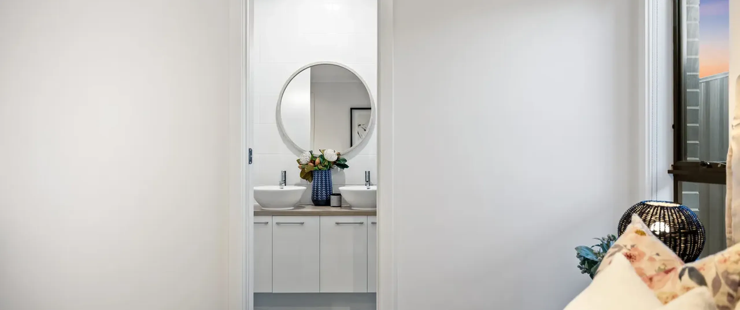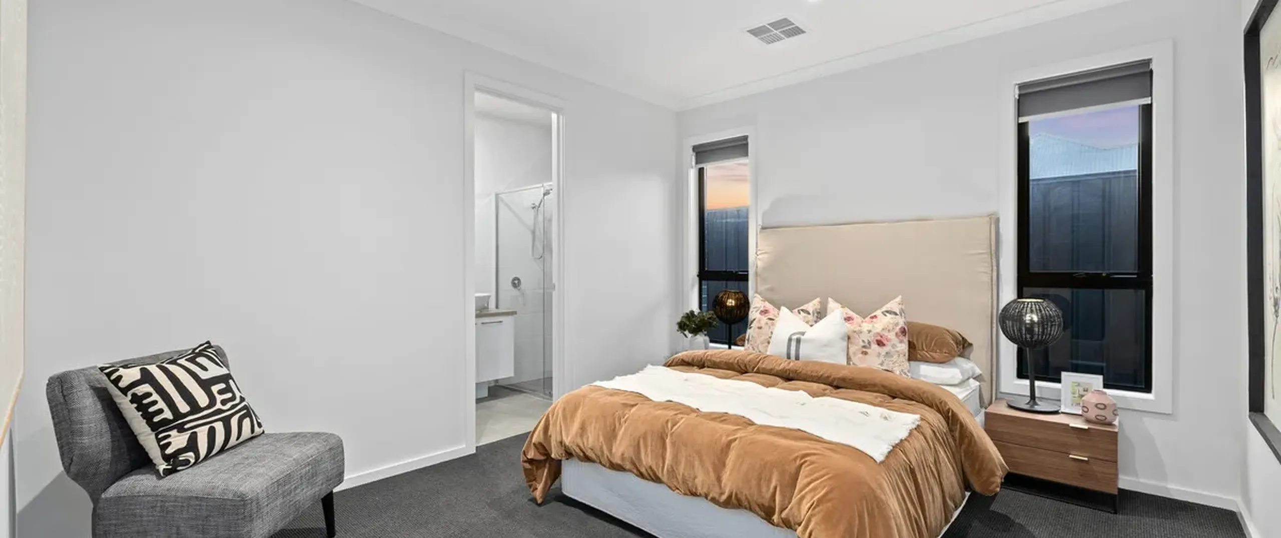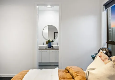 - Bedroom 1 offering a walk-in robe and ensuite with double sink vanity and floor to ceiling tiles