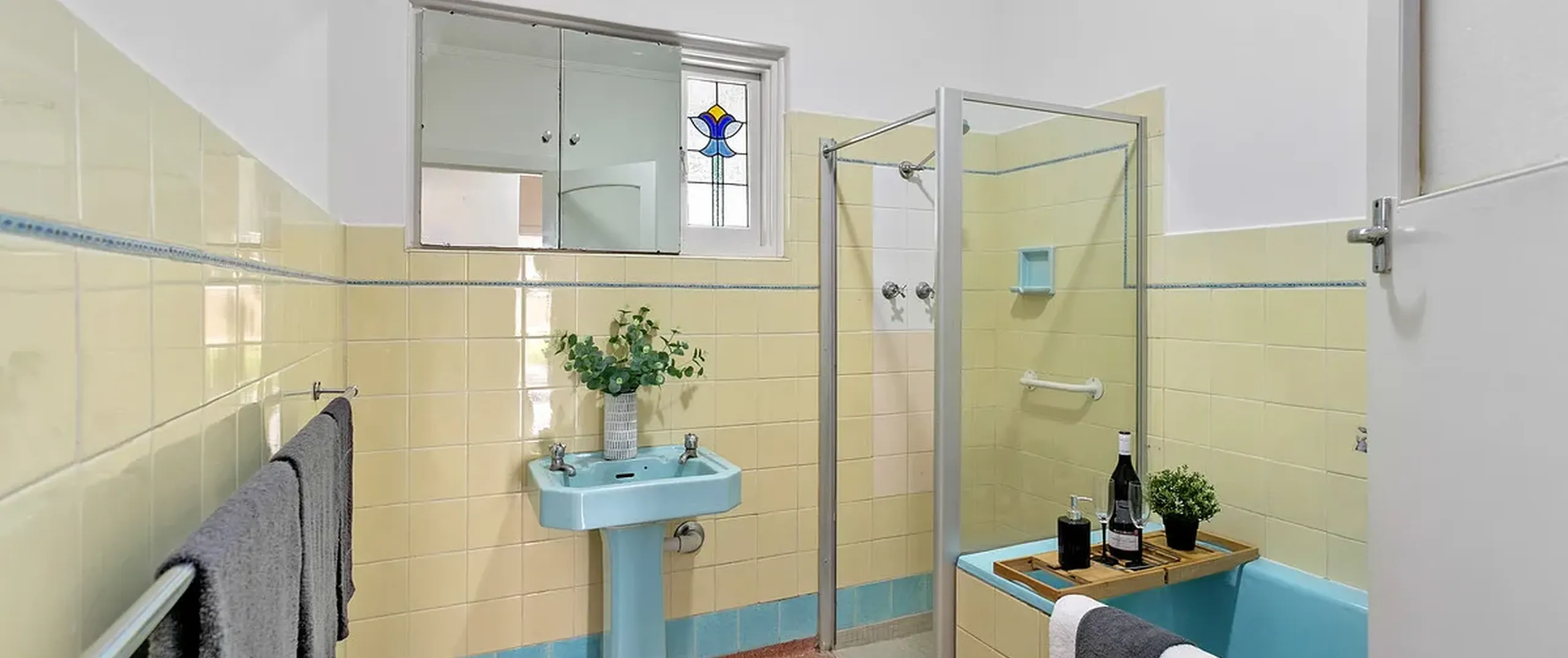 - Main bathroom with bath, shower and stained glass window