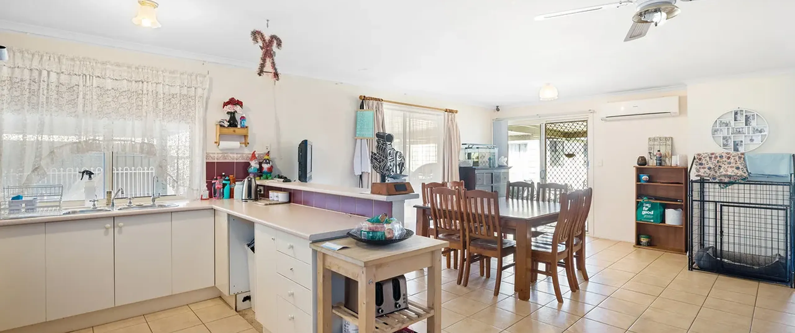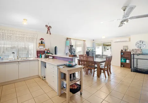 - Open plan kitchen, living and dining area with ceiling fan and split system air conditioner