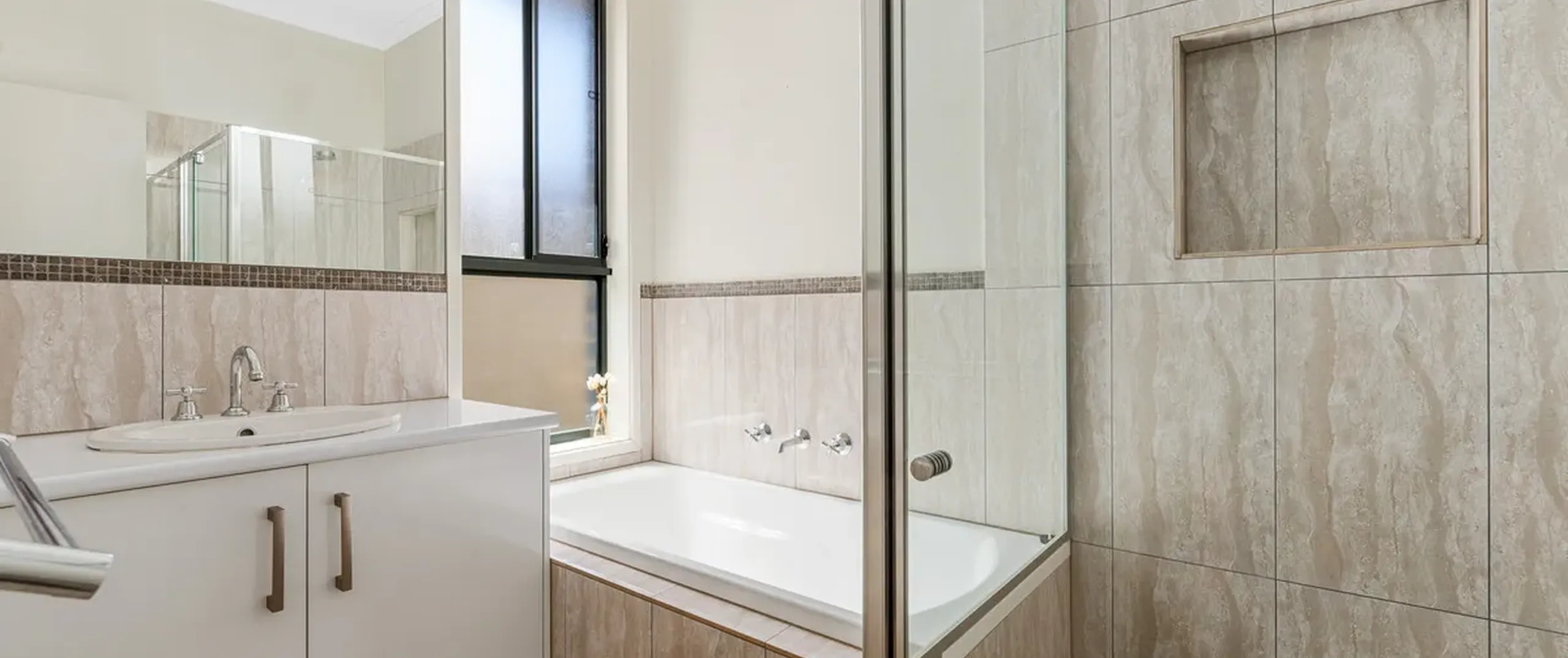 - Main bathroom with bath and separate shower, featuring a niche in the shower