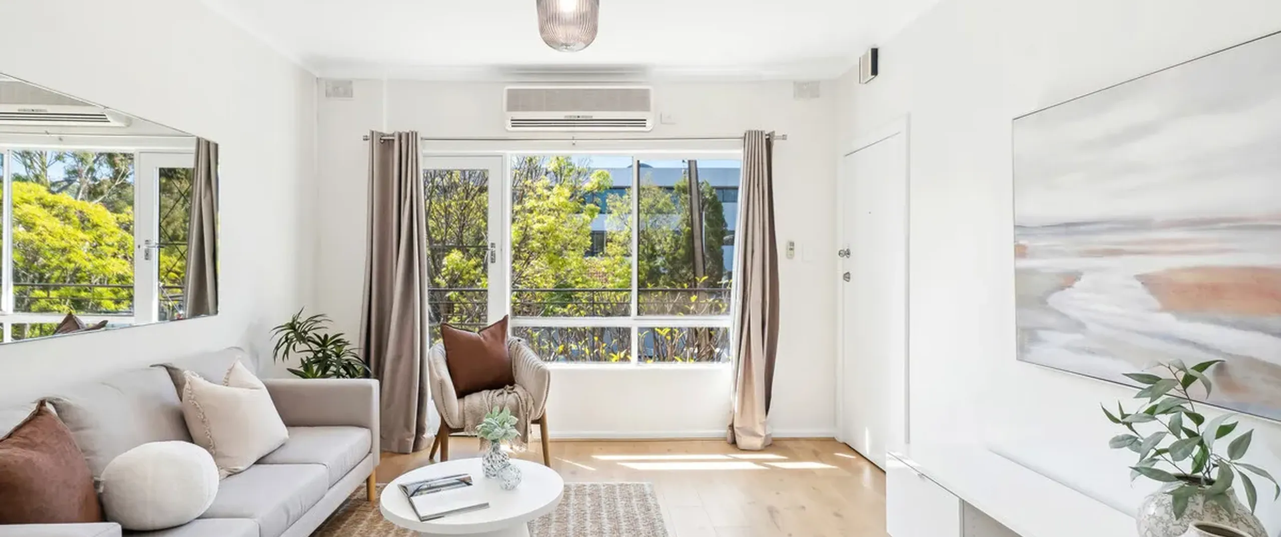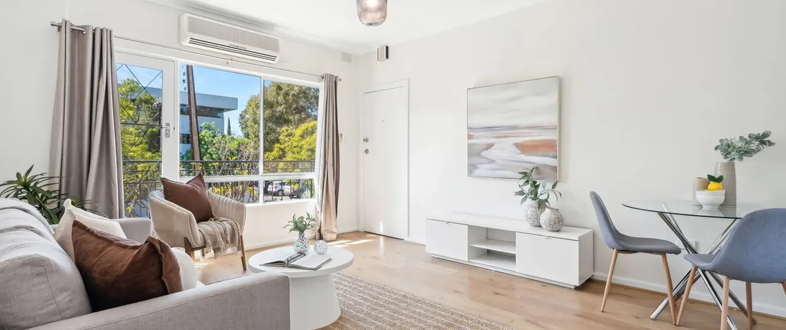 - Spacious living and dining area with split system air conditioner and balcony