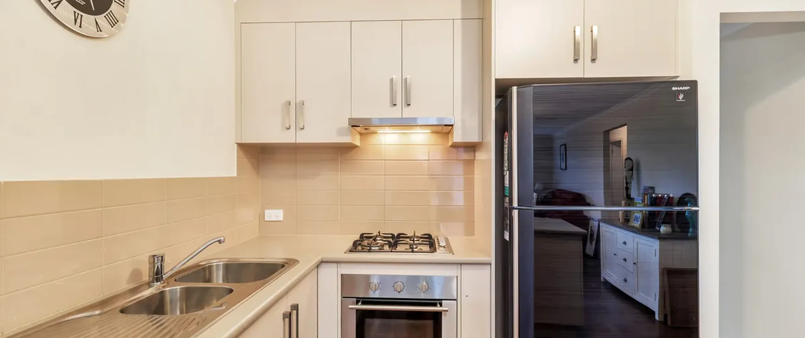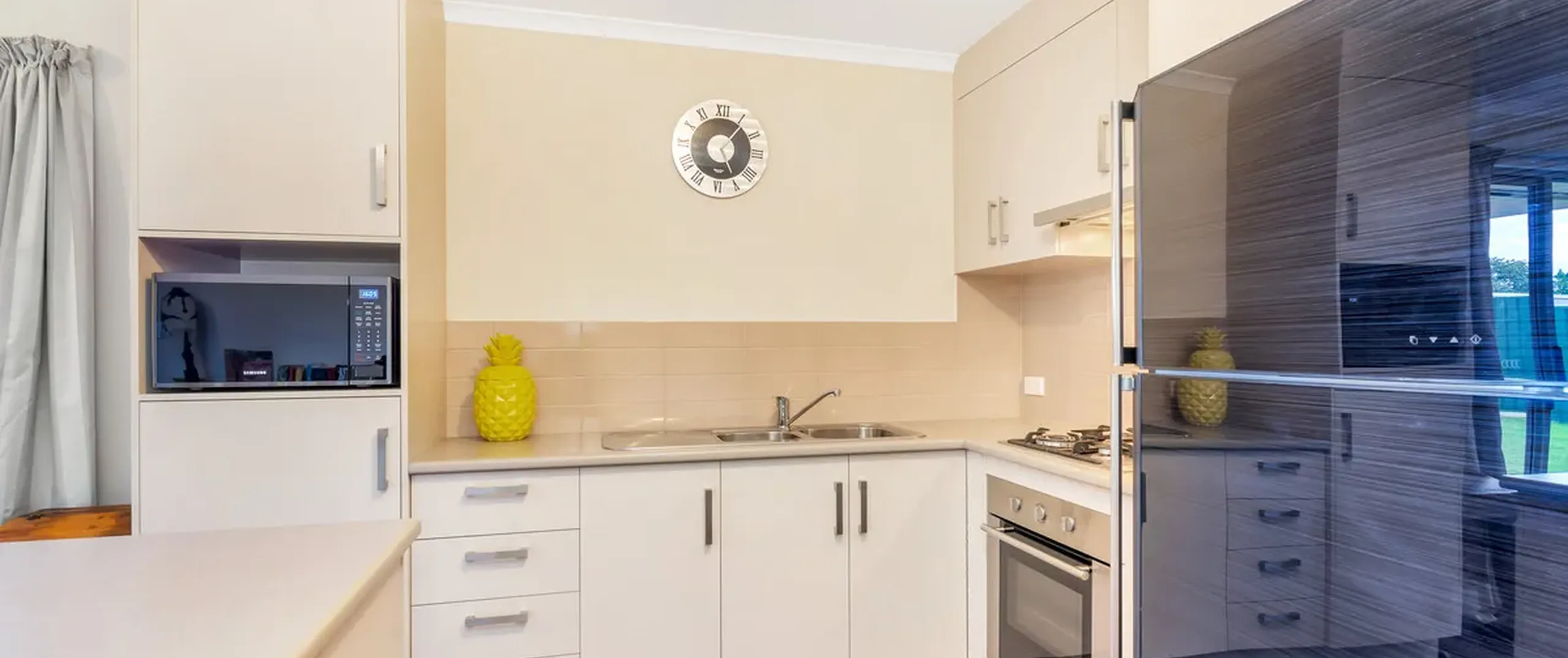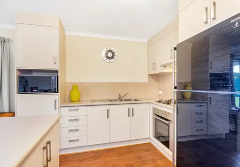 - Modern kitchen with gas cooktop, ample bench and cupboard space and island bench