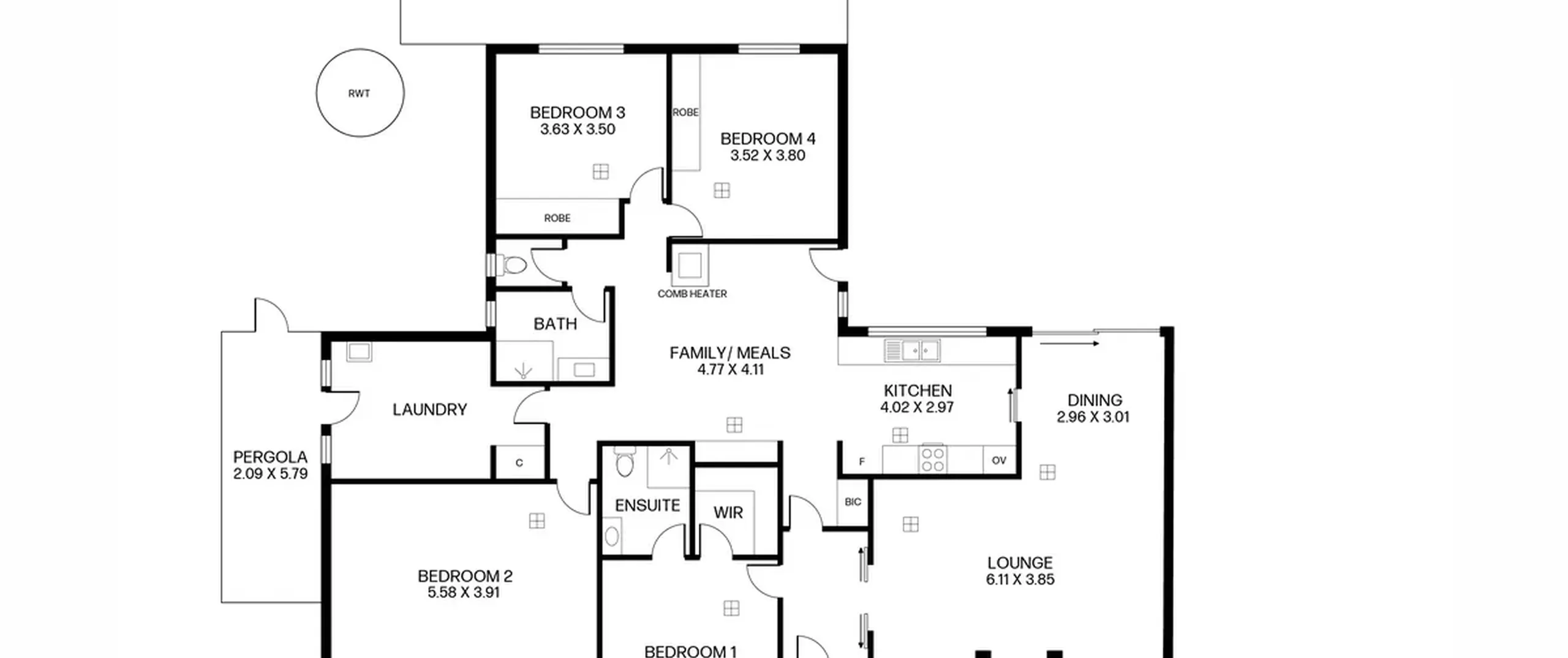 Inside, you’ll find four generously sized bedrooms, two bathrooms, and a welcoming living space that exudes warmth and comfort. At the heart of the home, the timeless kitchen offers ample storage, seamlessly connecting to the spacious family and meals area—designed to meet the needs of your entire family.