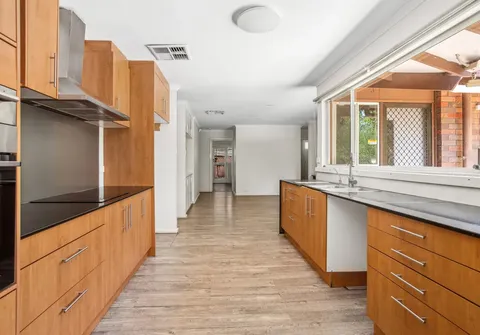 - Timeless kitchen with sweeping benchtops and ample cupboard and bench space