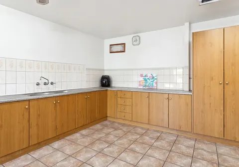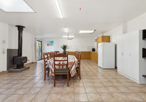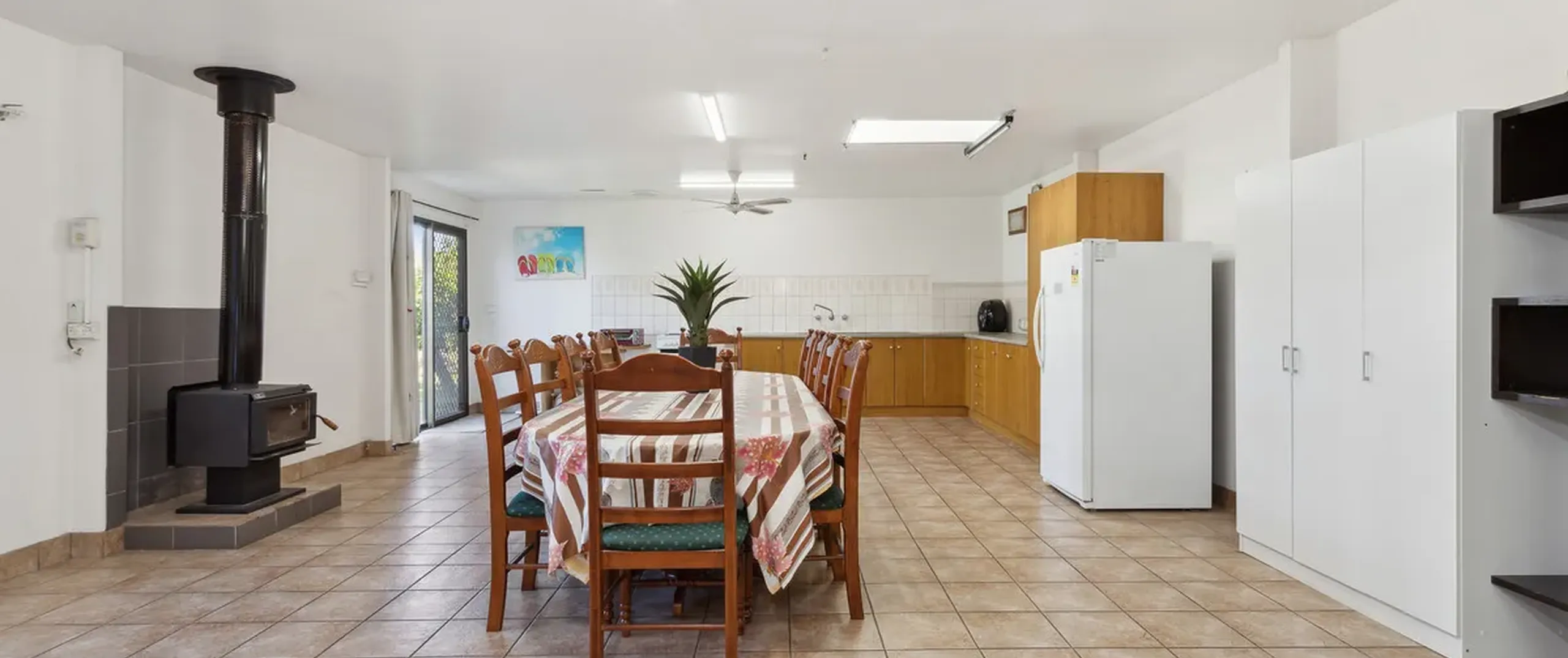 - Large separate rumpus room offering a kitchen space with ceiling fan, combustion heater, and air conditioning