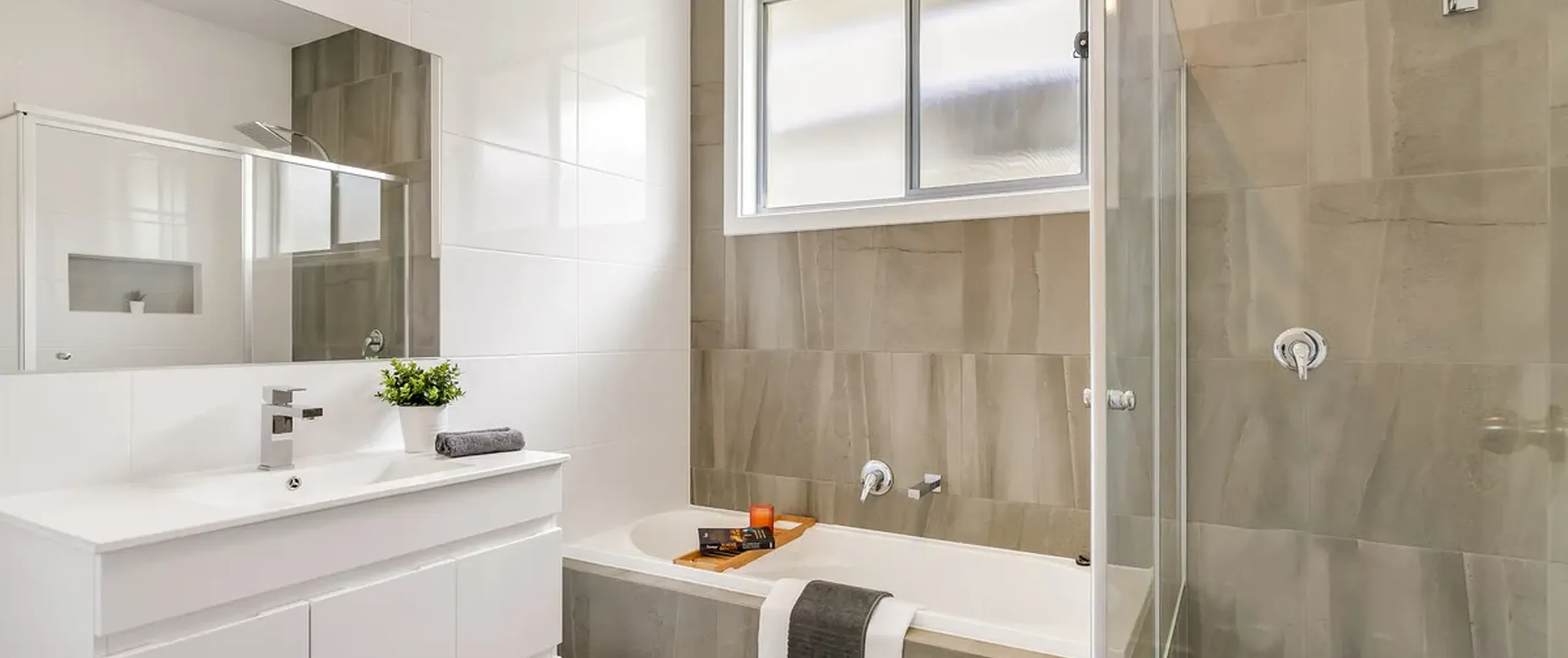 - Immaculate main bathroom with floor-to-ceiling tiles, separate bath and shower + separate toilet