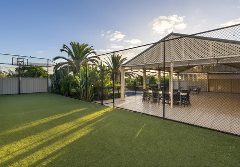The true showstopper lies beyond the doors as you step outside. Entertaining family and friends will become an absolute delight under the enormous pitched roof entertaining area, offering panoramic views of the basketball court and the sparkling inground swimming pool. Beyond this haven, a sprawling lawn area awaits, providing ample space for various activities or the freedom for your pets to play. The layout is perfected with two garages including an oversized garage, catering to the storage needs of your most cherished possessions or secure parking for the entire family.