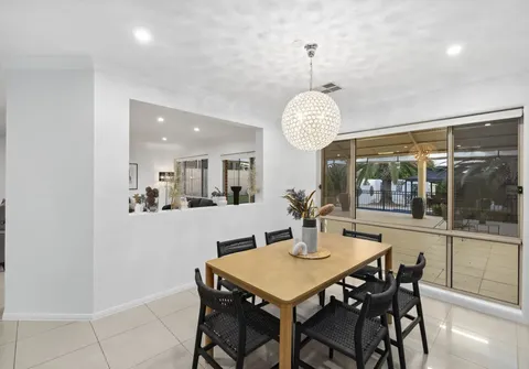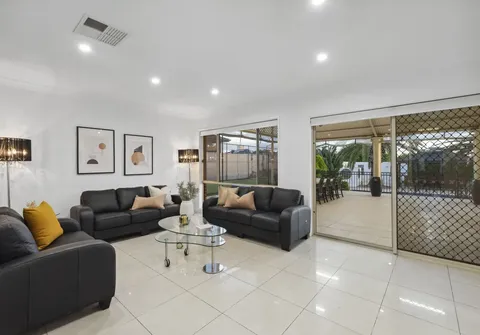 The grandeur is evident from the moment you step through the double entrance, where a soaring coffered ceiling and a breathtaking chandelier set the tone. Follow the path of gleaming tiles that guide you through the elegant lounge and a versatile home office, which can effortlessly transform into a 5th bedroom. The journey continues into an inviting open-plan kitchen, family, and meals space, complemented by an adjacent games room. The timeless kitchen, equipped with top-tier appliances and expansive countertops, seamlessly integrates with the living area, creating a perfect space for everyday living.