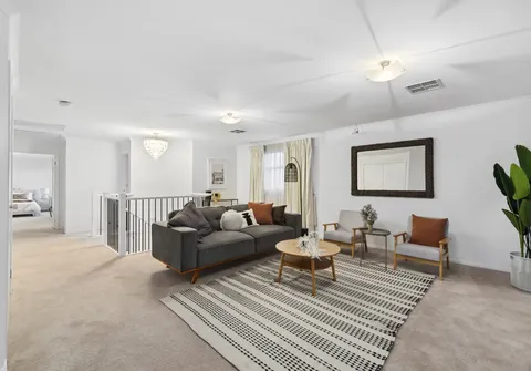 The upper level unveils four bedrooms, with the master suite taking center stage, featuring his and hers walk-in robes and a lavish ensuite complete with a spa bath. The upper level is further complemented by a main bathroom and a generously sized living space, adding to the allure of the home.