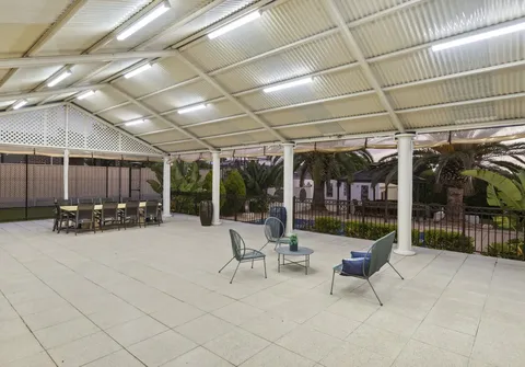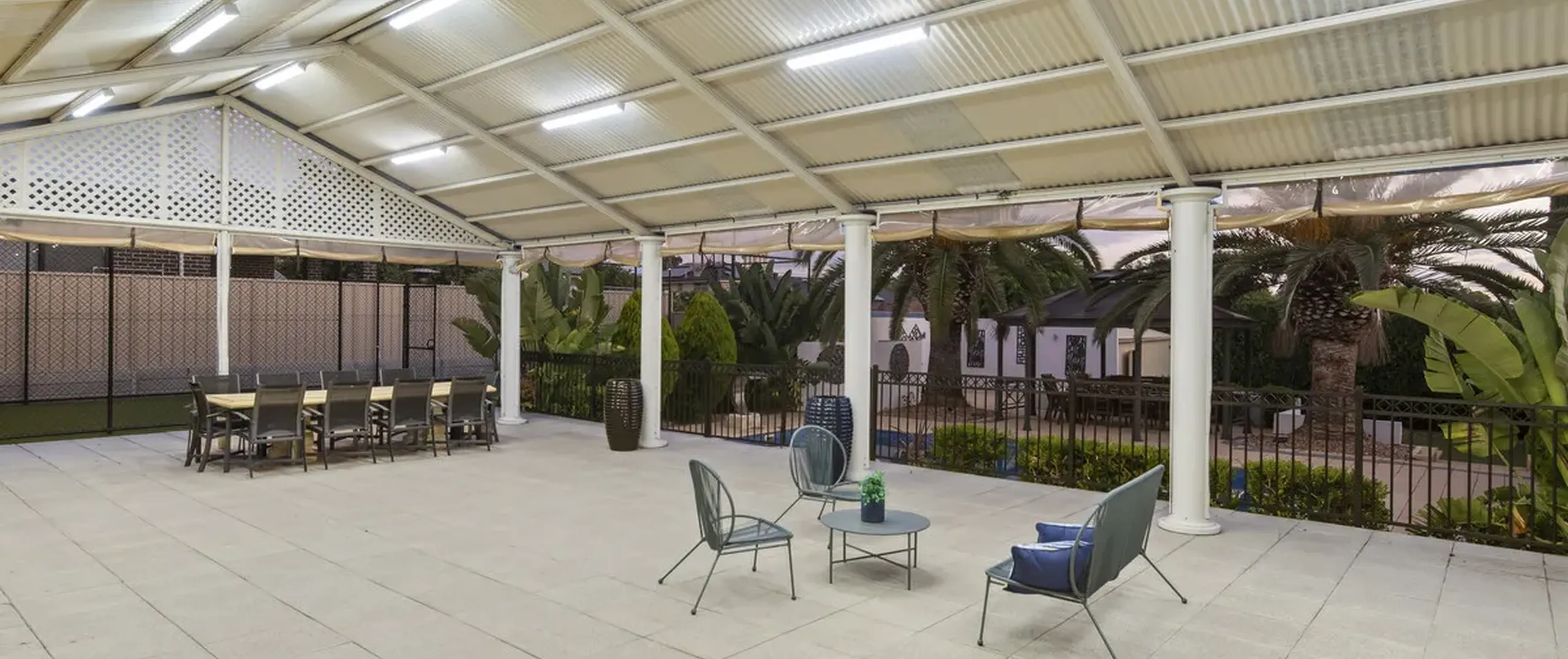 - Enormous outdoor entertaining area with pitched roof pergola and cafe blinds