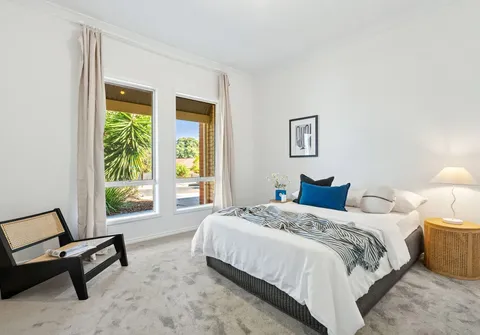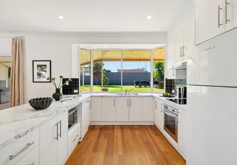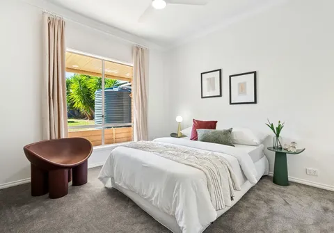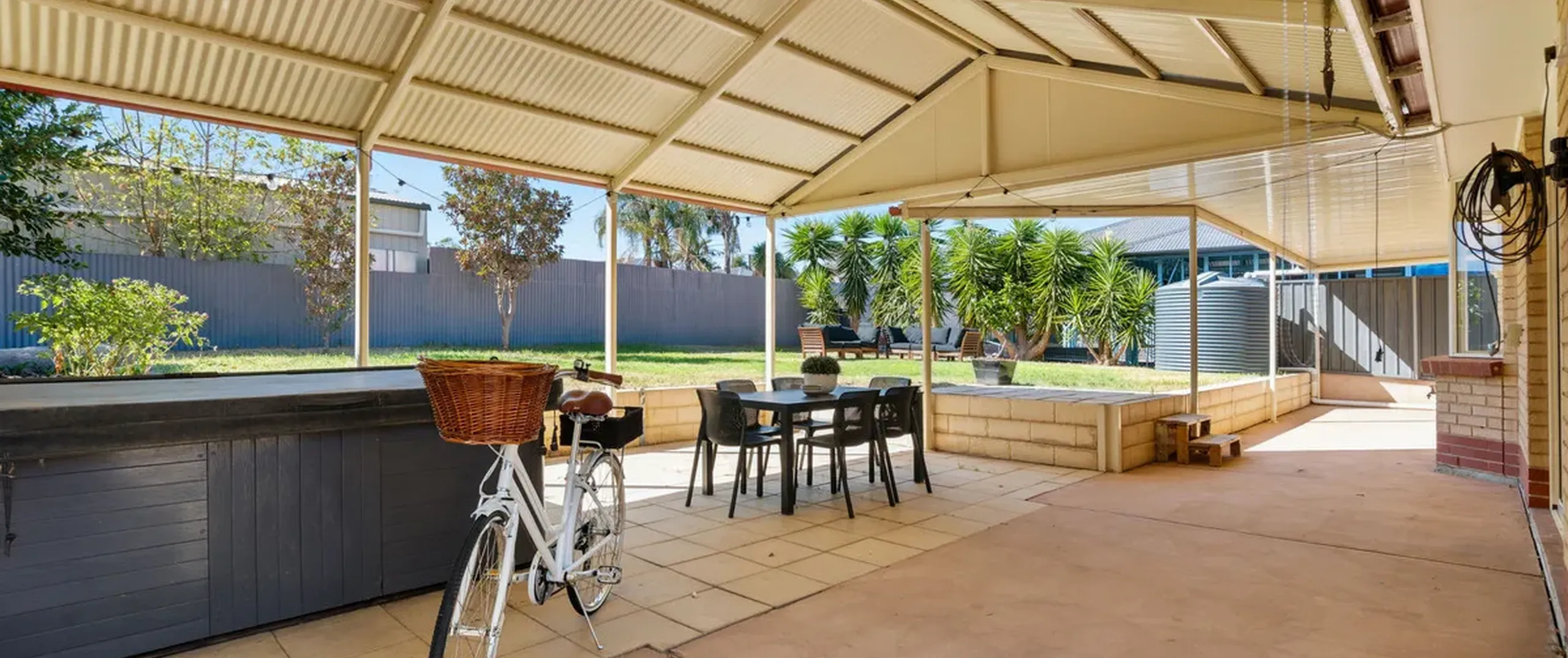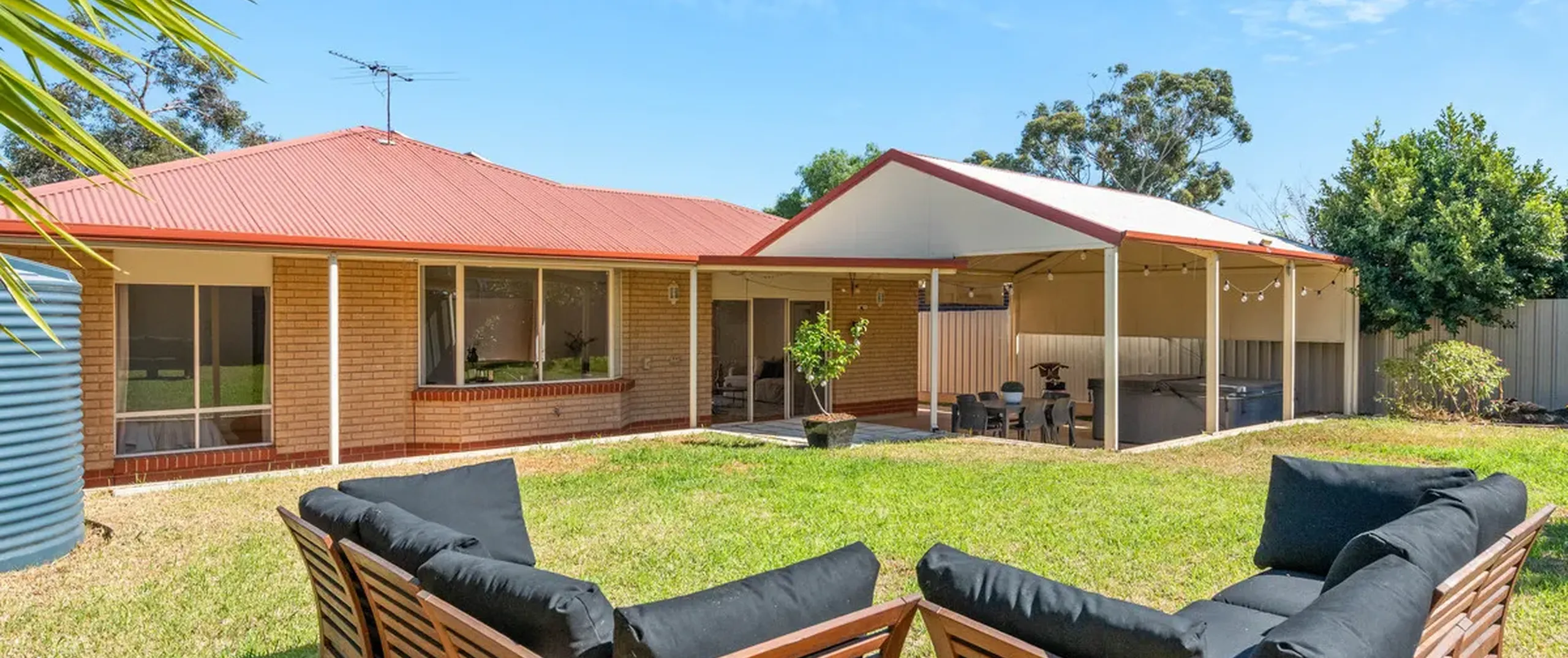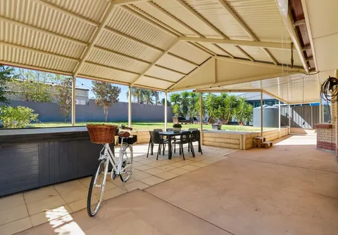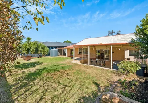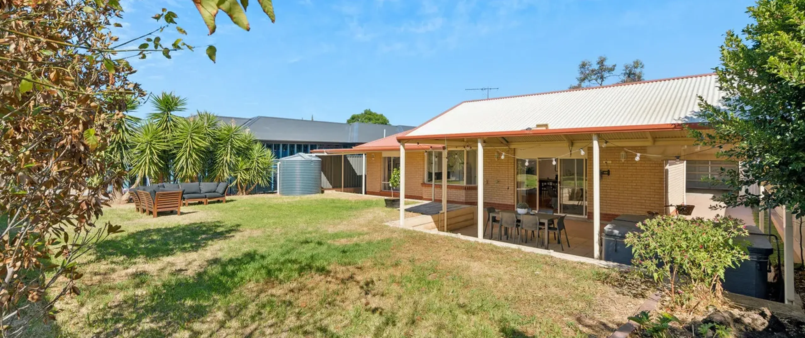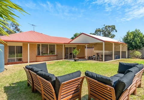 Step outside, and you'll find an effortless entertaining haven, complete with a pitched roof pergola, perfect for hosting family and friends all year round. The large grassed area provides plenty of space for kids and pets to play, while a double carport with a drive-through roller door to the courtyard adds convenience and versatility.