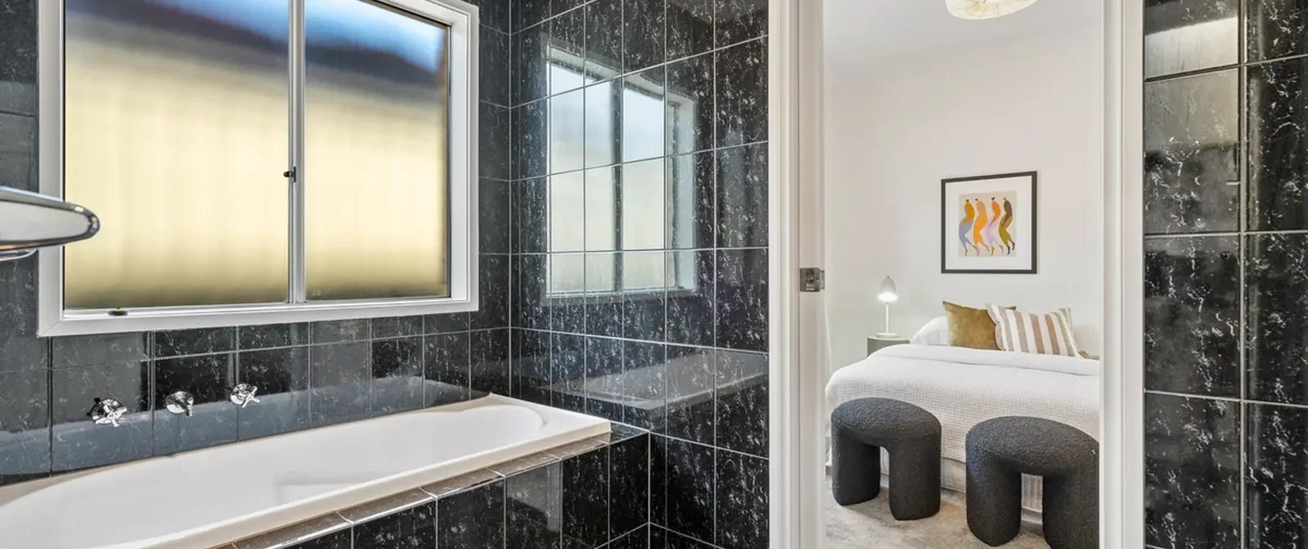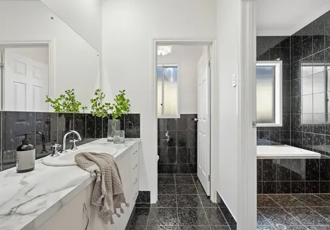 At the heart of the home is the stunning chef’s kitchen, overlooking an additional living space. Featuring sweeping marble-look benchtops, ample storage, and a charming bay window with views of the lush backyard, this kitchen is as practical as it is stylish.