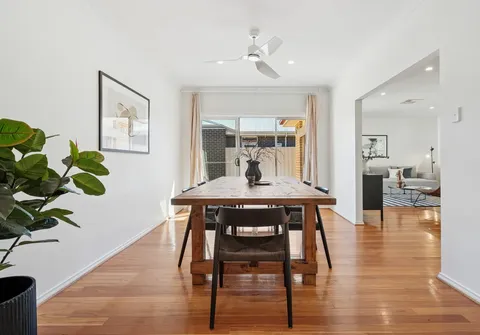 From the moment you step inside, you'll be welcomed by a bright and airy entryway, crisp white walls, and sleek hard wood floorboards that flow seamlessly into the light-filled lounge and formal dining area. Large windows, glass doors, high ceilings and LED downlights create a warm and inviting atmosphere, while ceiling fans add an extra touch of comfort.