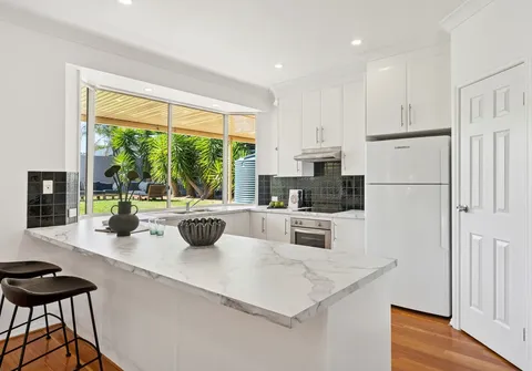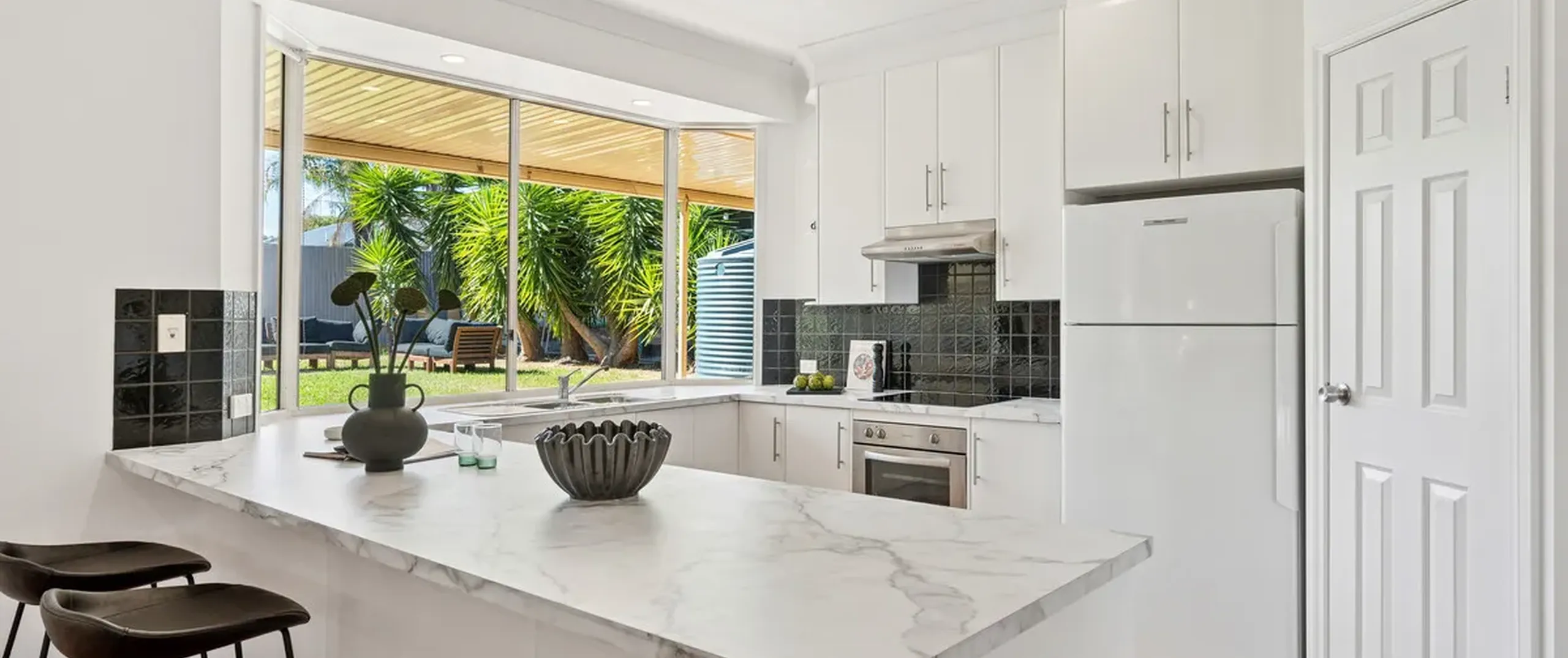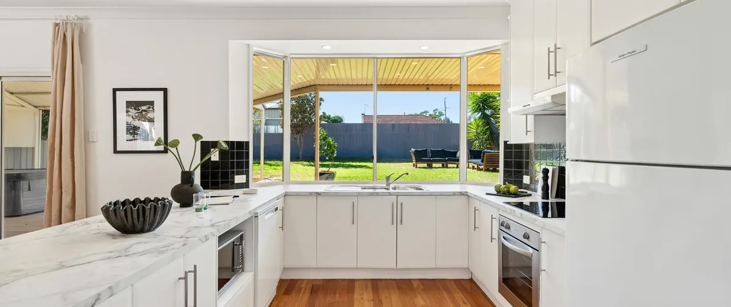 - Sleek kitchen with marble look bench tops, ample storage space, breakfast bar and beautiful bay window