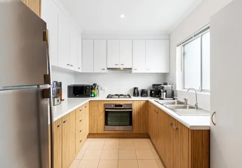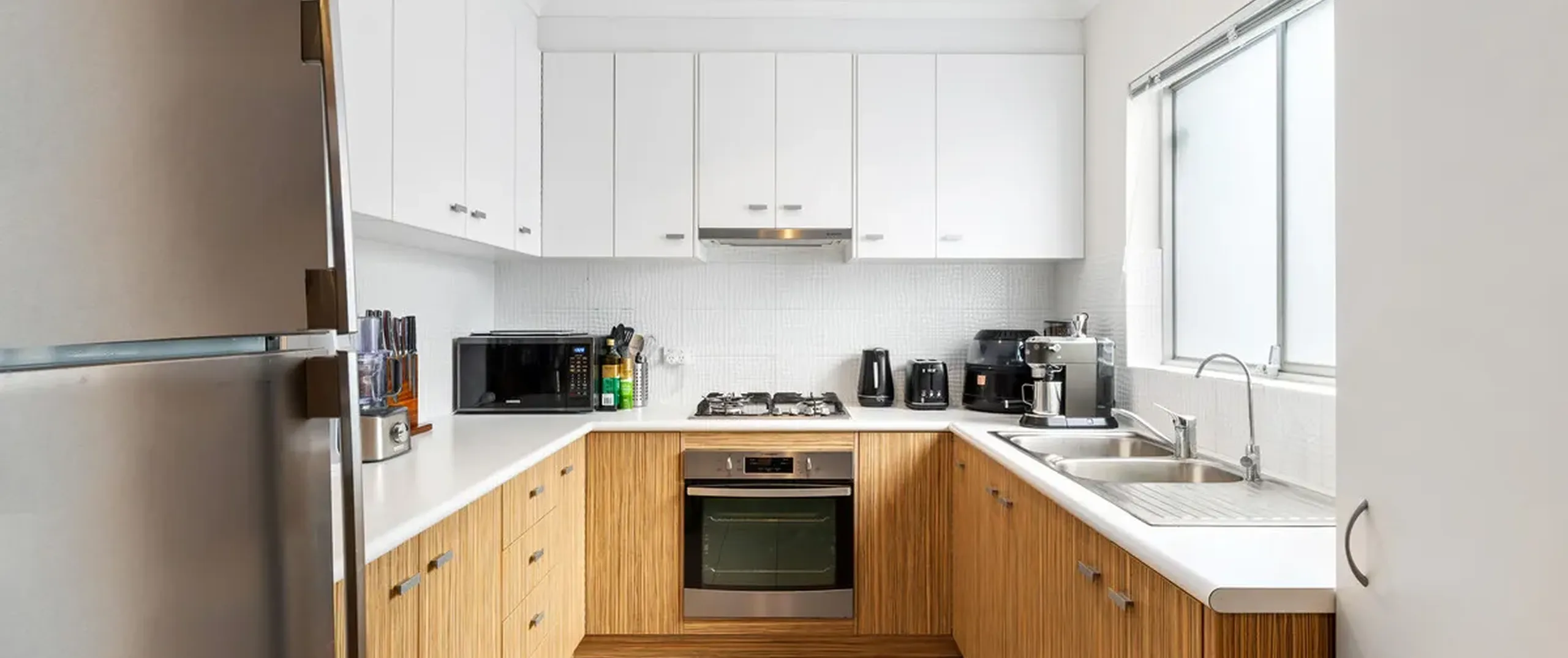 - Trendy, white kitchen complete with ample cupboard and bench space and feature timber accents