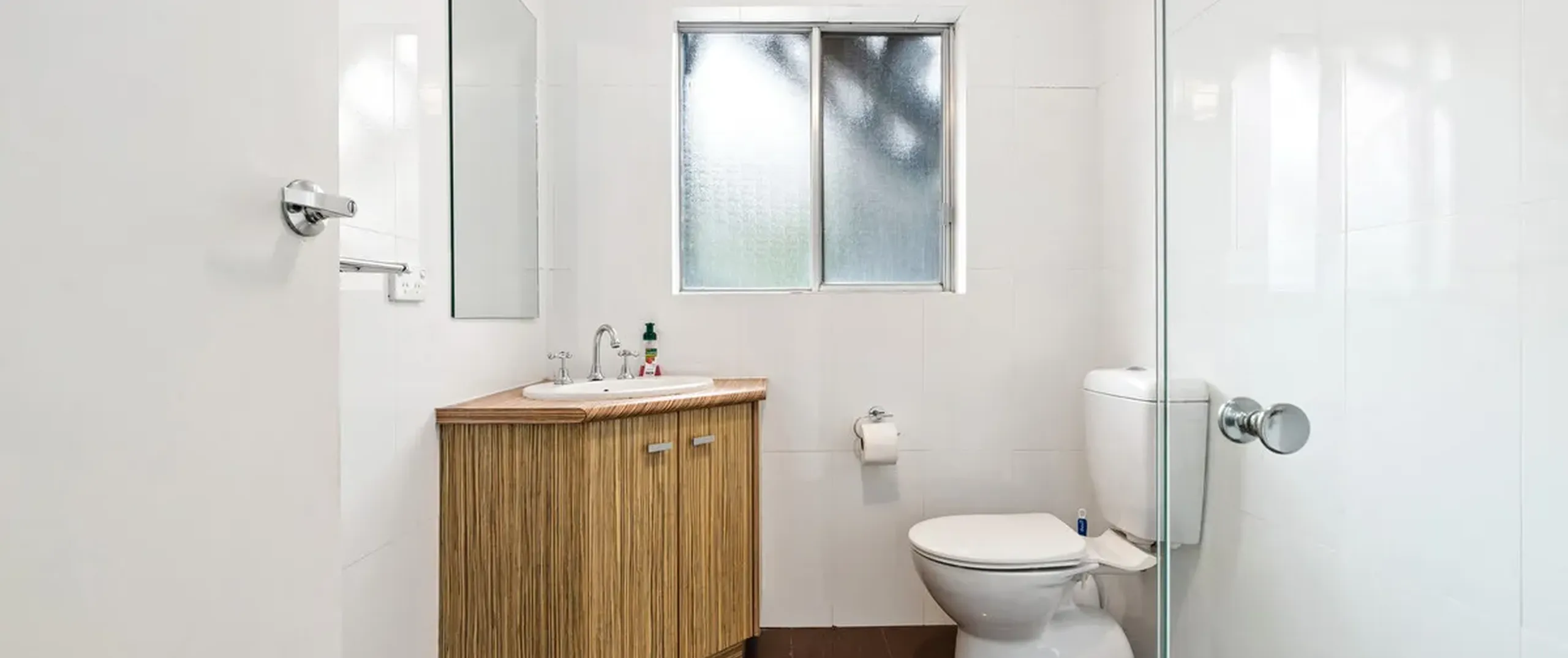 - Neat & tidy bathroom with floor to ceiling tiles, shower, and toilet
