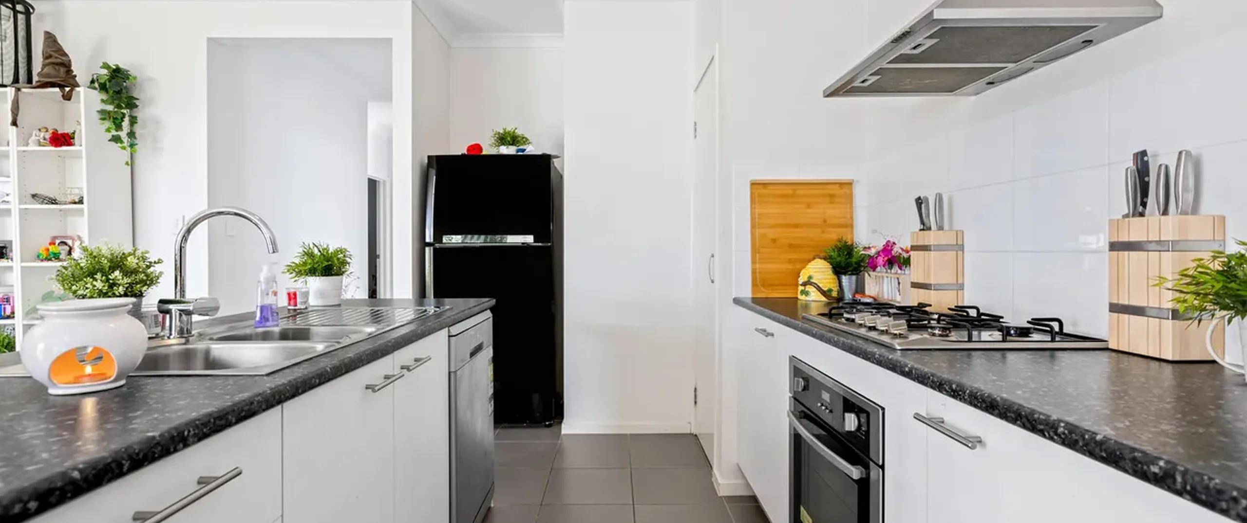 - Modern galley style kitchen offers stainless steel appliances including gas cooktop and dishwasher, good sized pantry and breakfast bar
