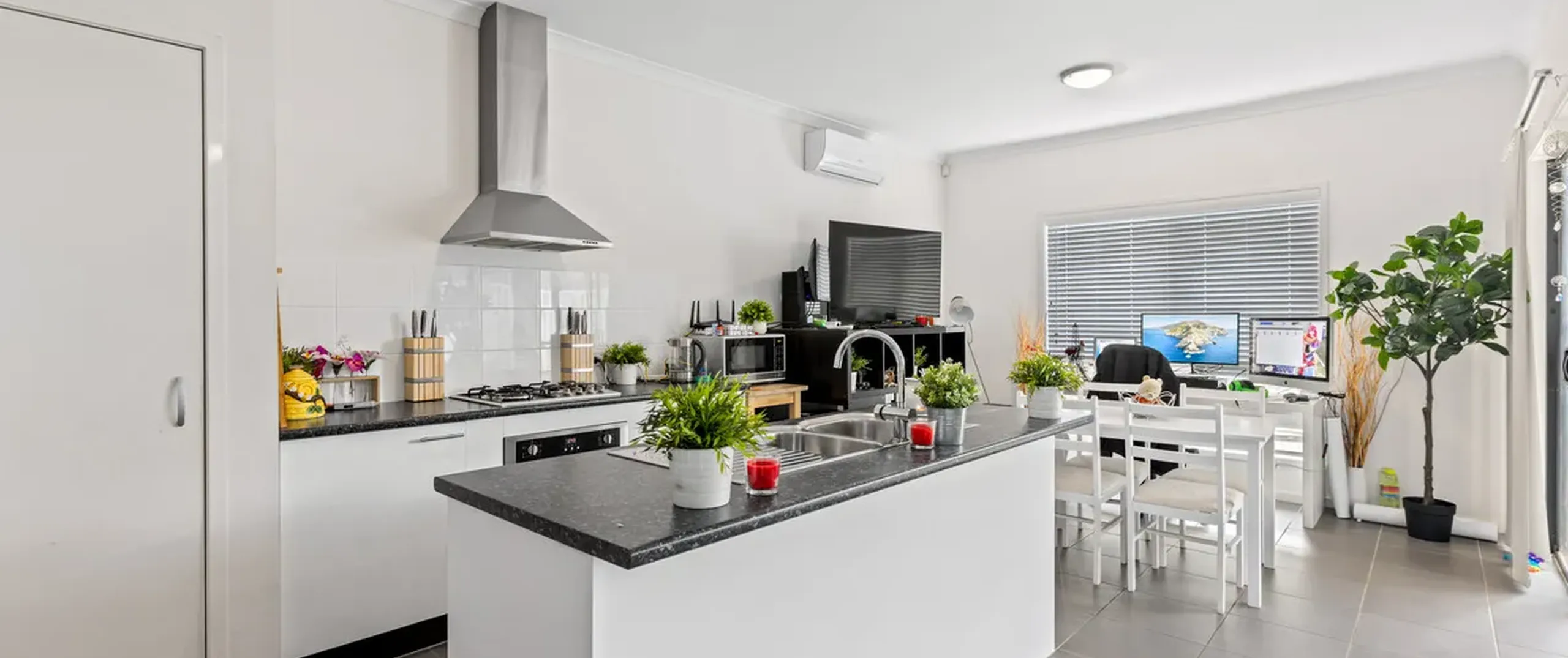 - Light-filled, open plan kitchen, dining and living room with split system air-conditioning