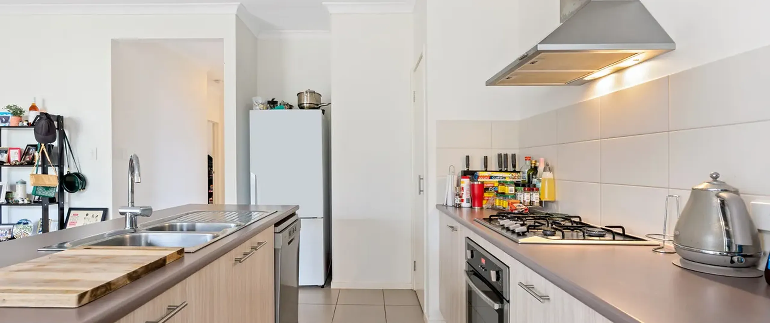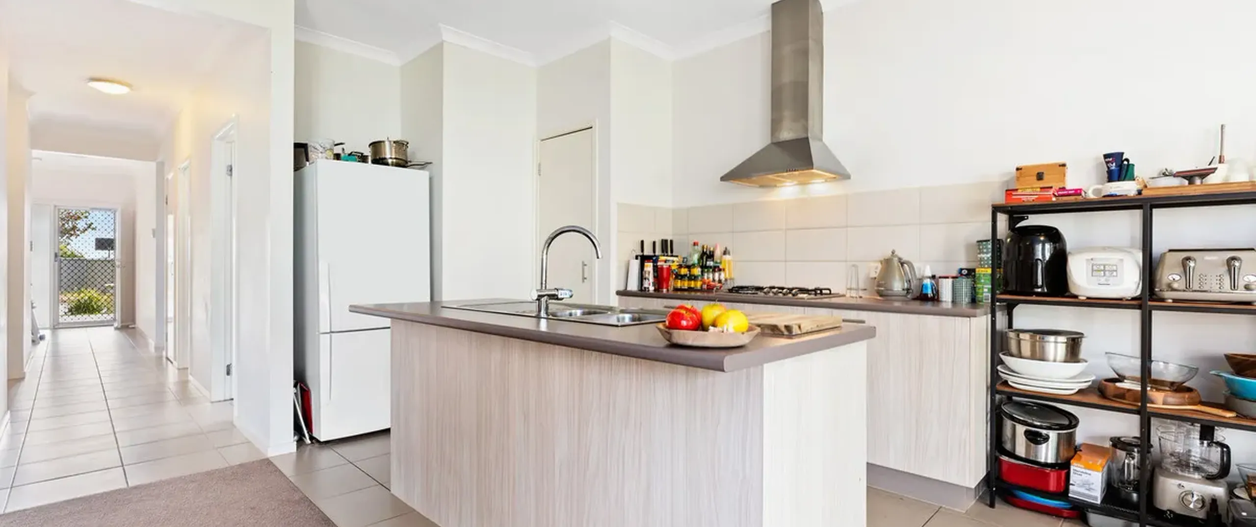 - Contemporary kitchen with stainless steel gas cooktop, ample cupboard space and island bench