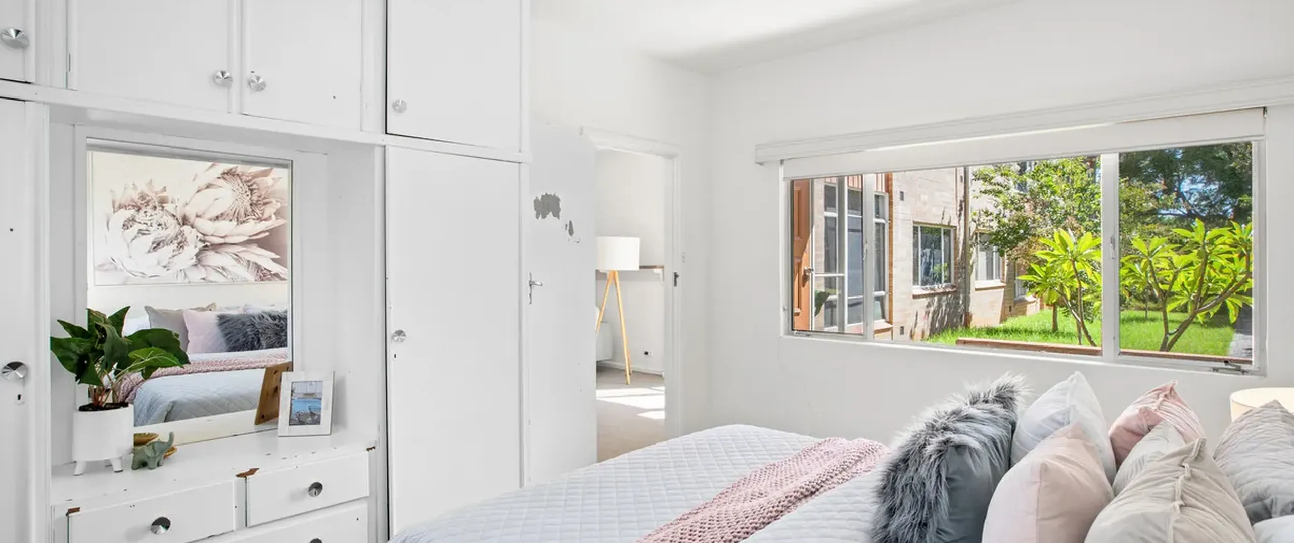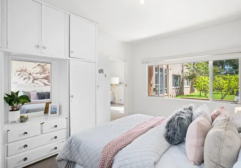 - Bedroom 1 with built-in cupboards and incorporated vanity
