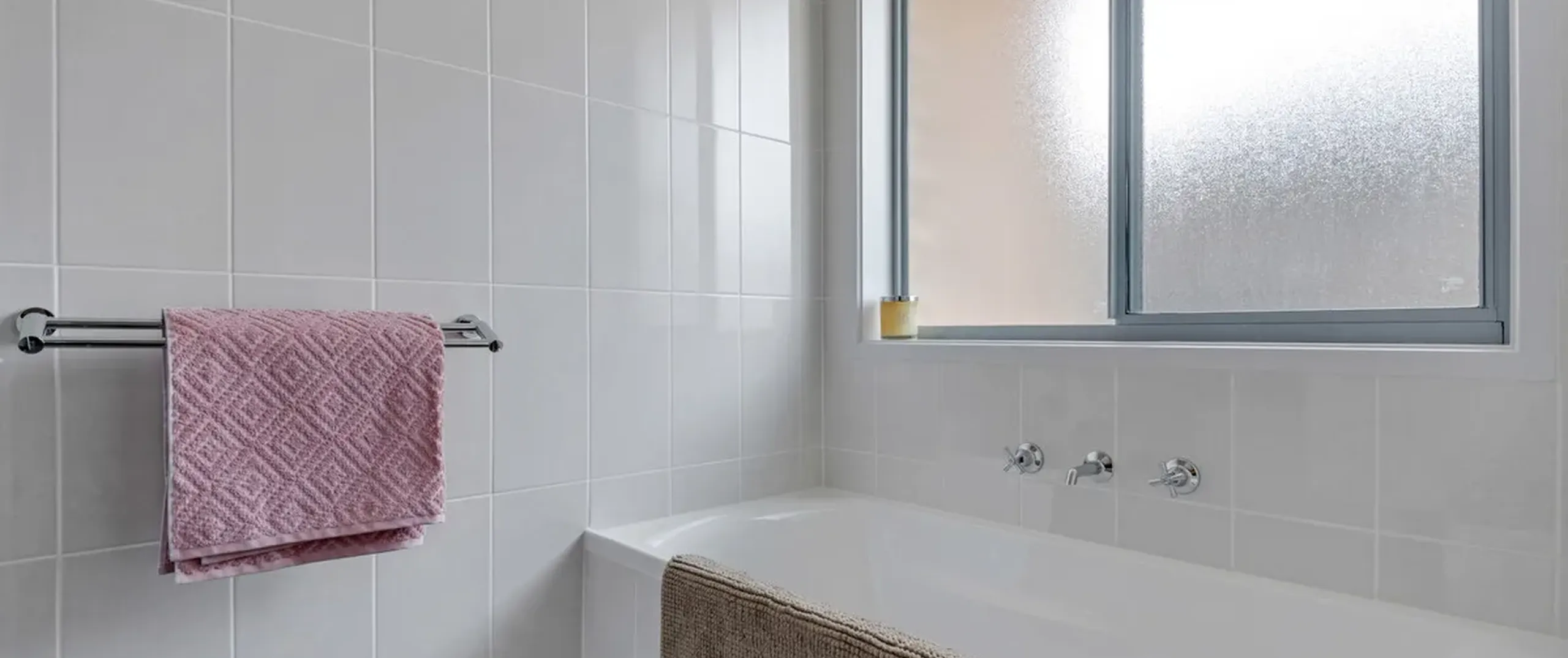 - Stylish main bathroom with separate bath and shower featuring floor to ceiling tiles + separate toilet