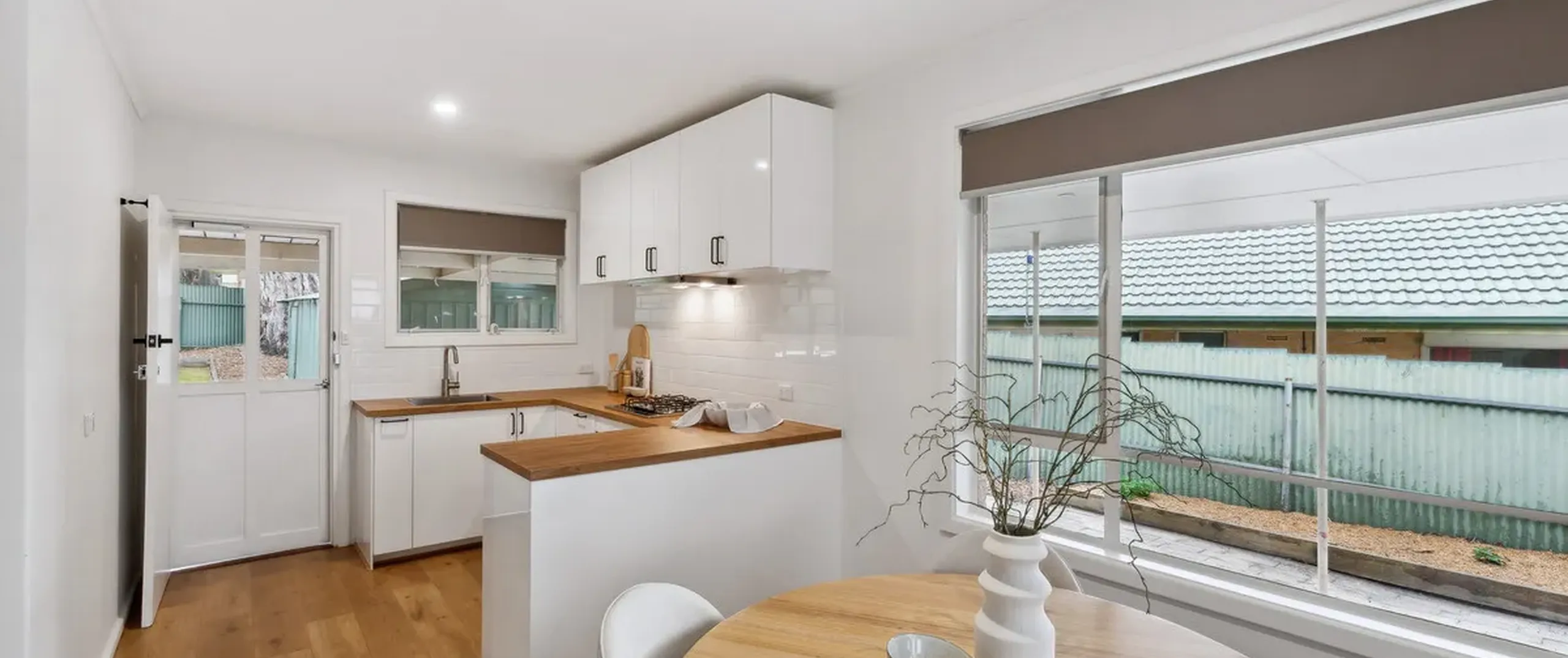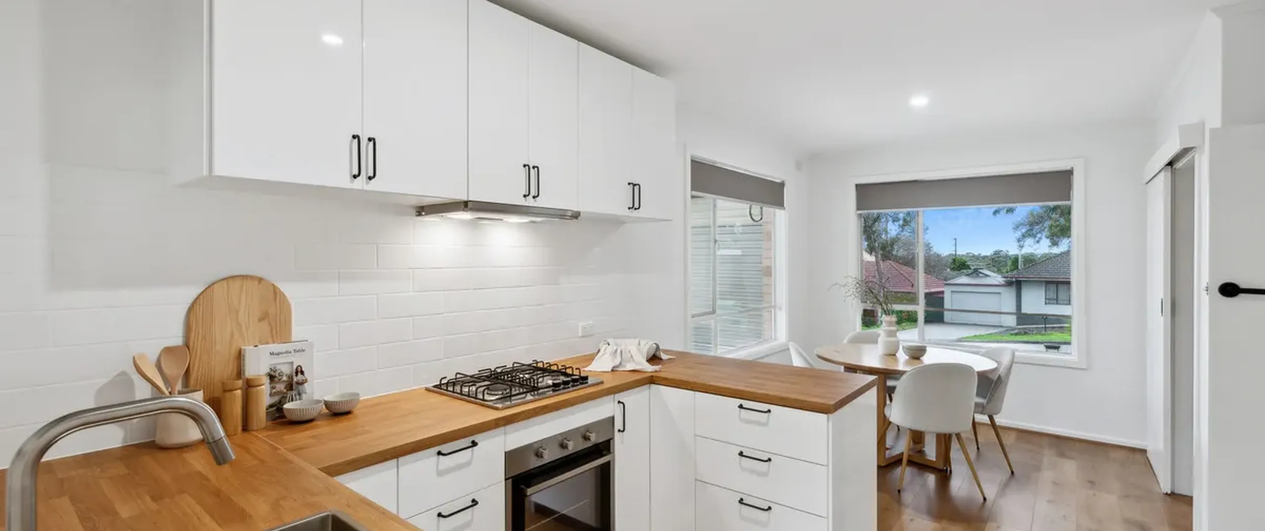 - Chić kitchen with gas cooktop and ample bench and cupboard space overlooking the casual meals area