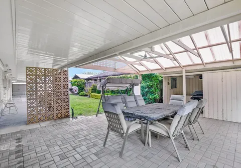 Outside, a large entertainer’s verandah awaits and overlooks the immaculate yard with beautiful greenery and fruit trees. The rear complete with a double length carport with roller door, an additional garage, multiple storage sheds and a shaded garden.