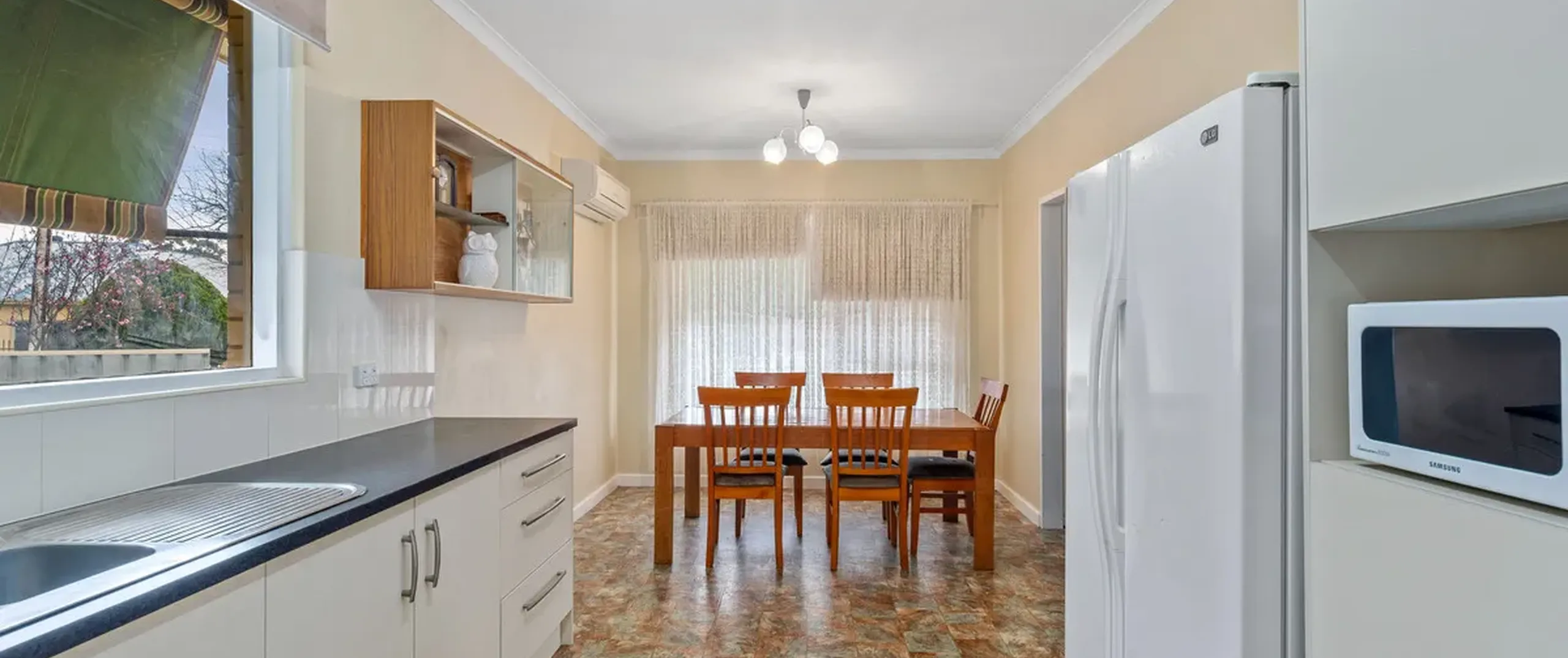 - Kitchen features meals area, split system air conditioner and freestanding gas cooker