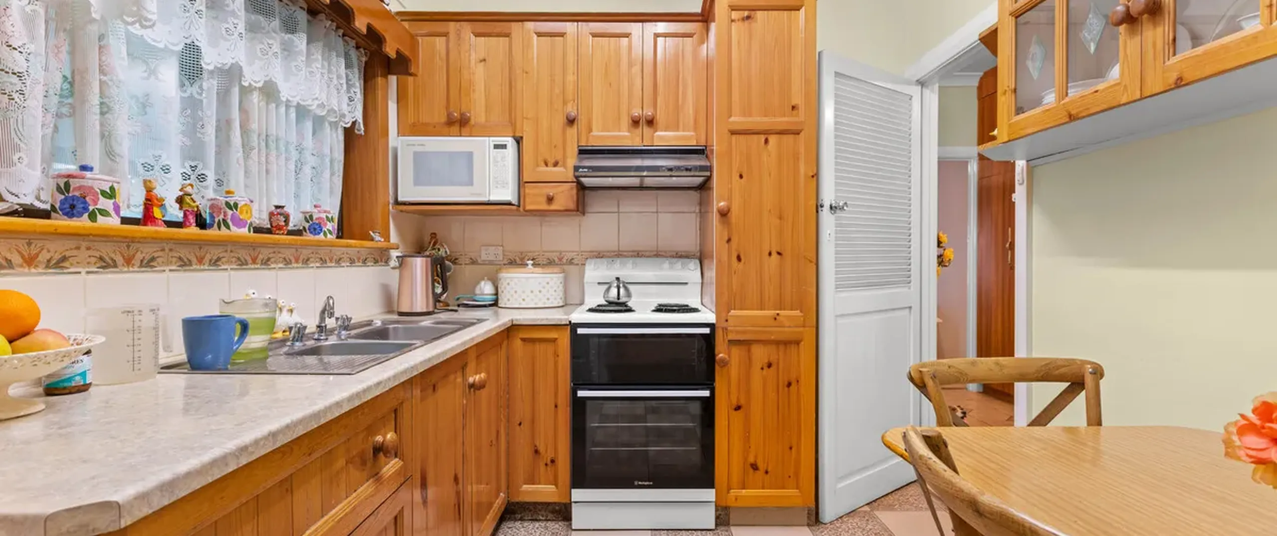 - Timber kitchen with standalone oven and cooktop, pantry, ample storage and bench space, all completed by skylight