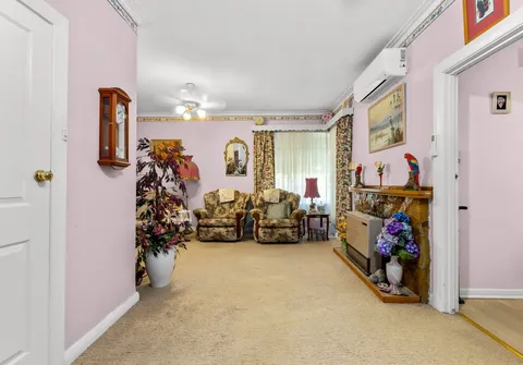 - Large lounge room with ceiling fan, split system air conditioner, heater and feature mantel piece