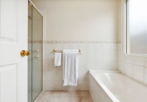 - Sparkling three-way bathroom with separate bath and shower and linen cupboard