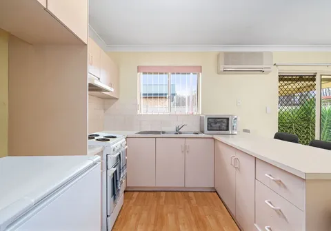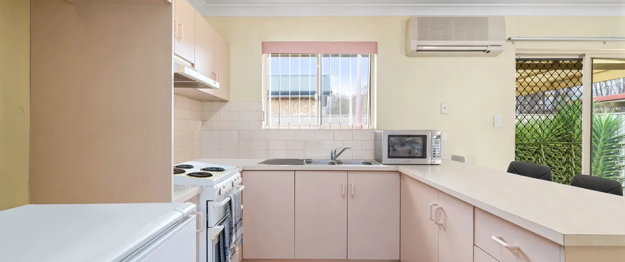 - Neutral kitchen featuring ample bench space including a breakfast bar, air conditioner and abundance of cupboard storage