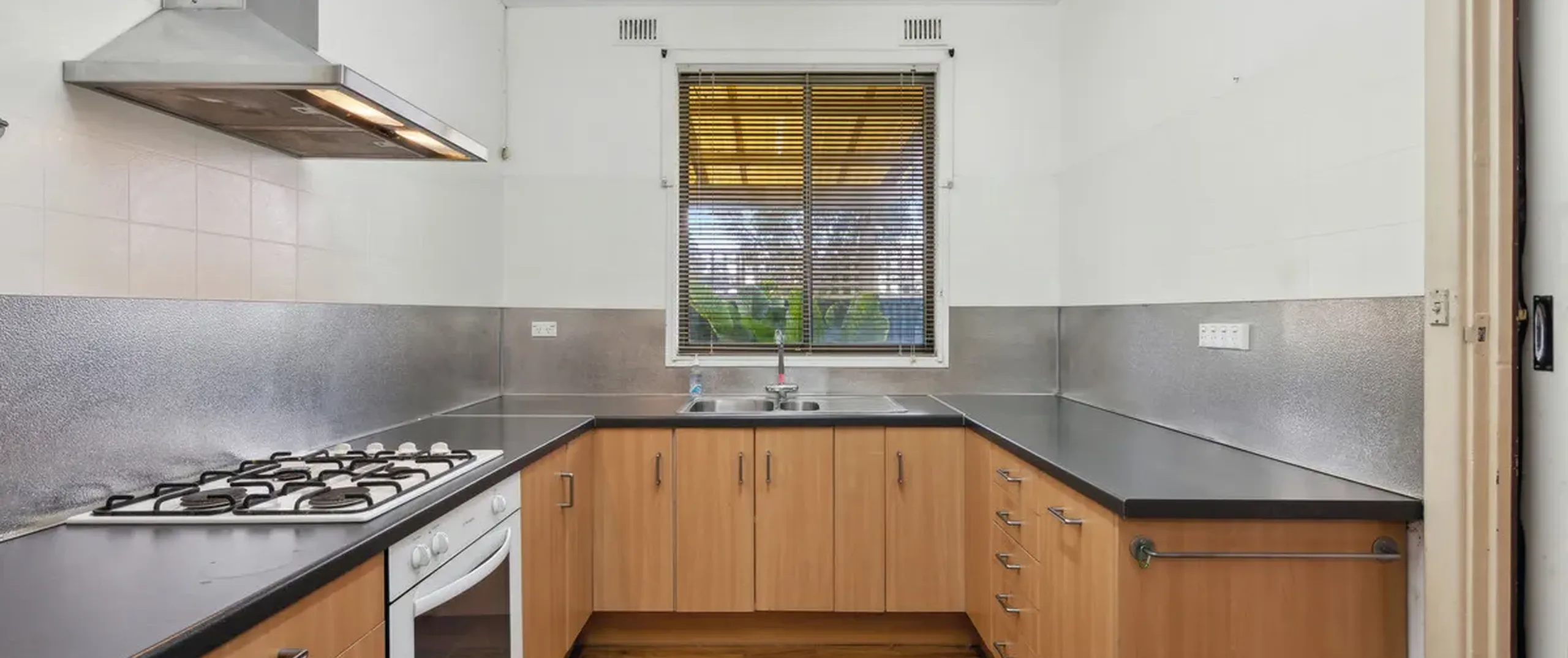 - Kitchen with gas cooktop and ample cupboard and bench space