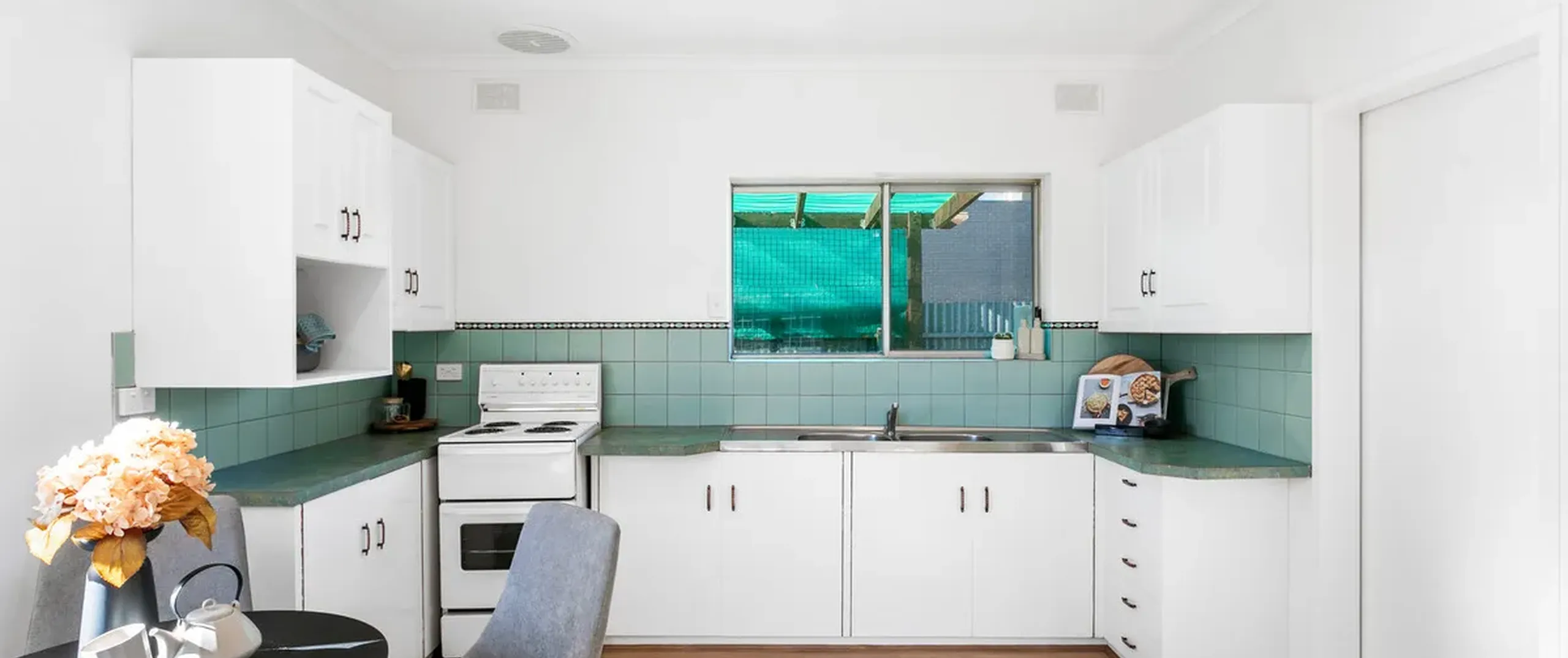- Easy care kitchen with standalone oven, ideal cupboard space with overhead storage and ample bench space