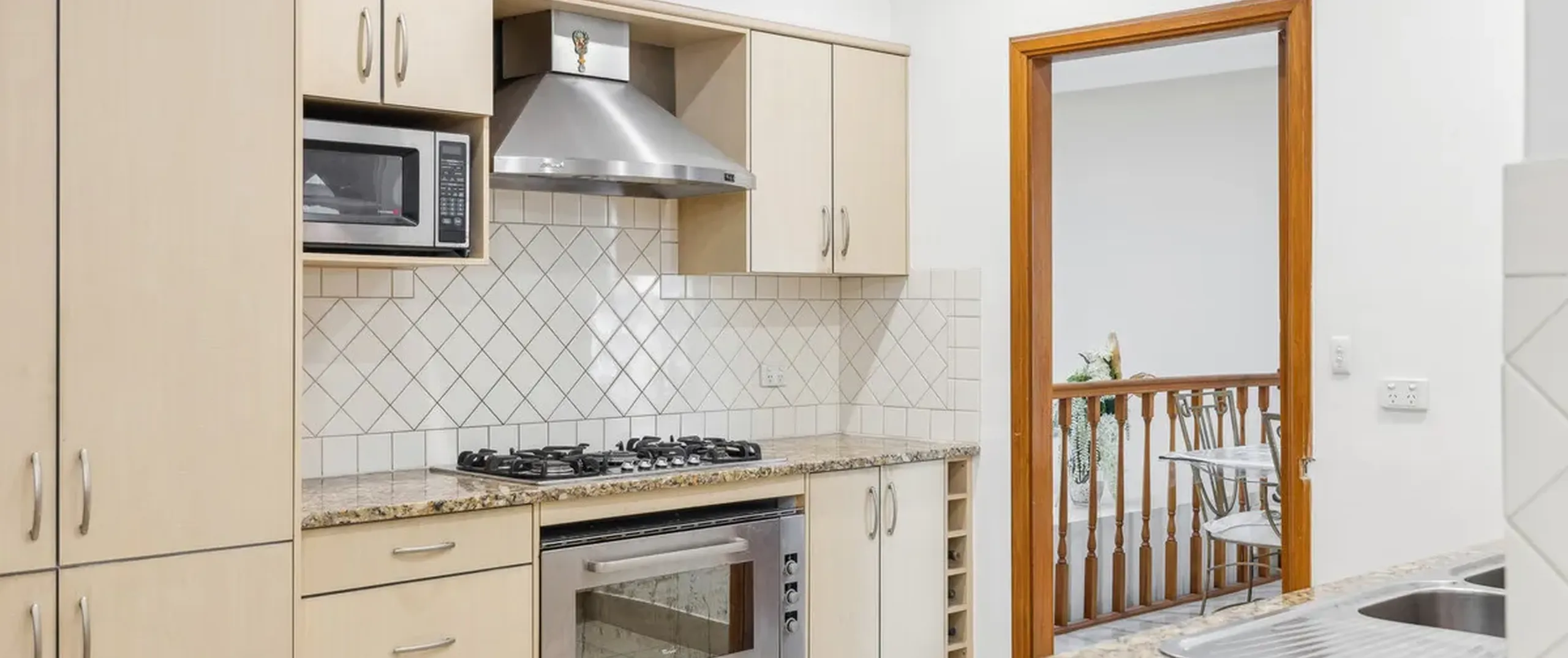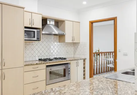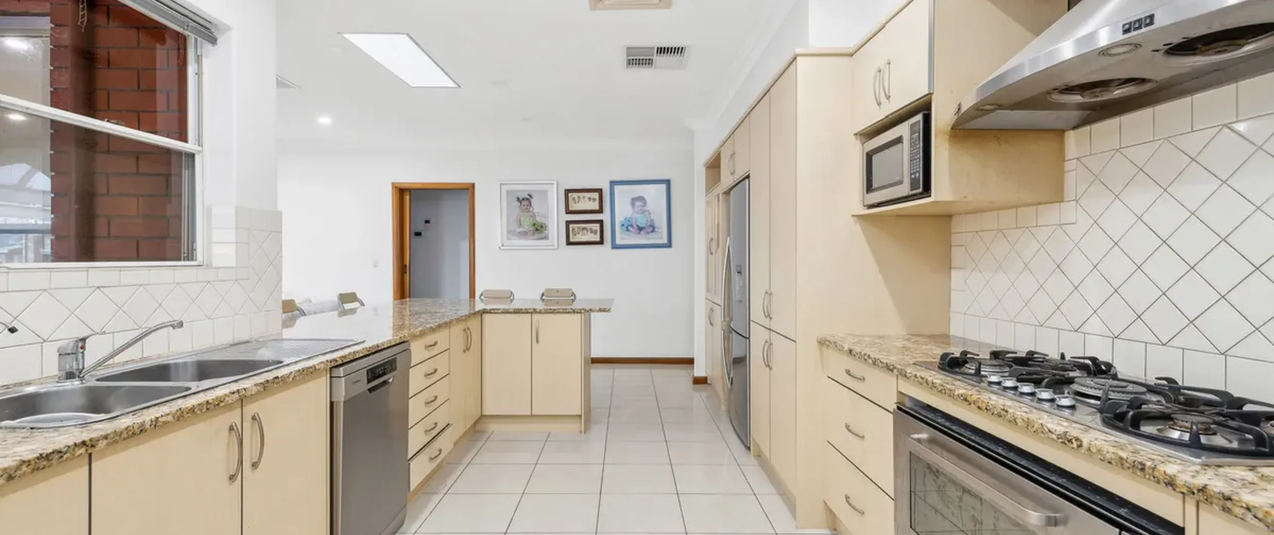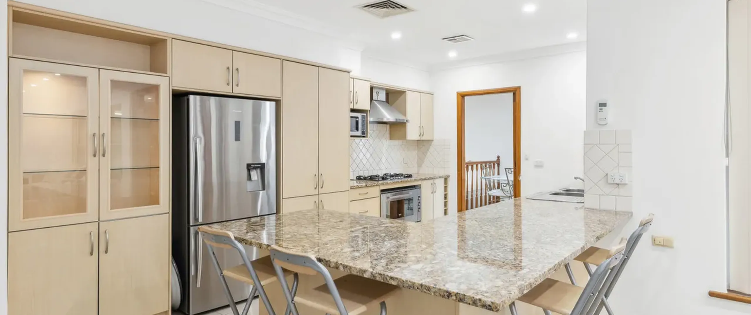 - Large kitchen with gas cooktop, dishwasher, breakfast bar, ample cupboard and bench space