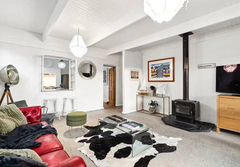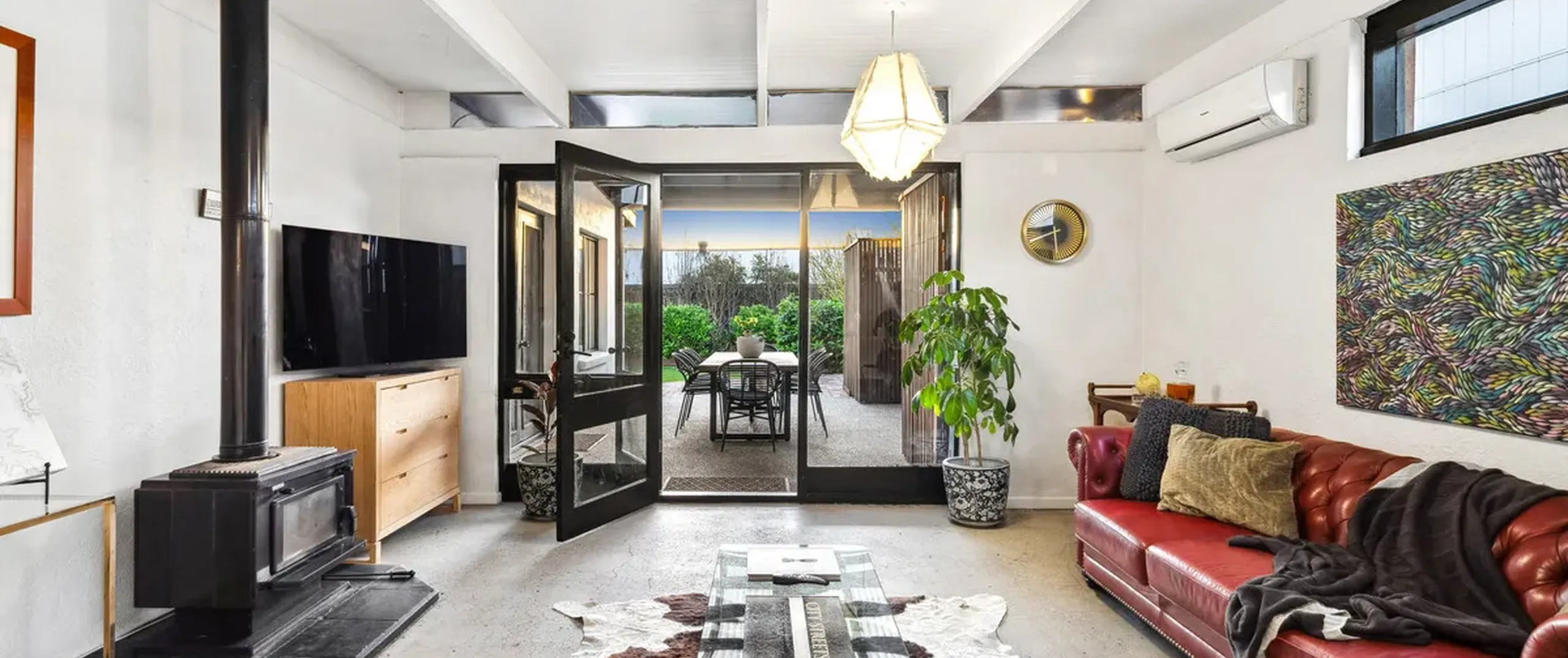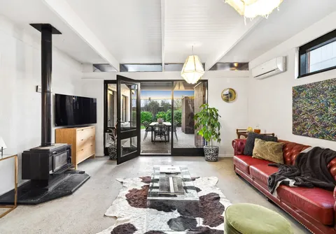 - Light-filled living room with polished concrete flooring, combustion heater, and glass doors leading to the outdoor entertaining area
