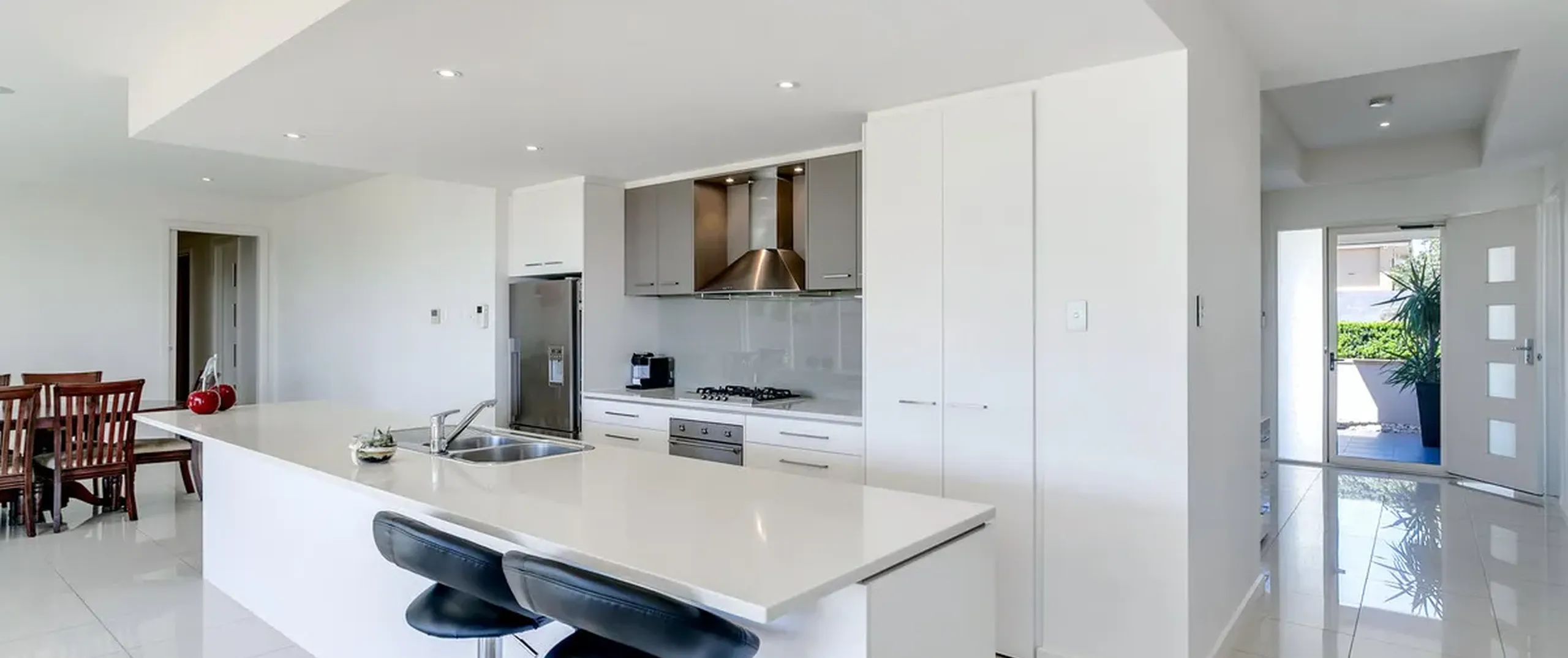 - Stunning Farquhar designer kitchen with Caesar stone bench tops, large walk-in pantry, Smeg stainless steel appliances and gas cooking