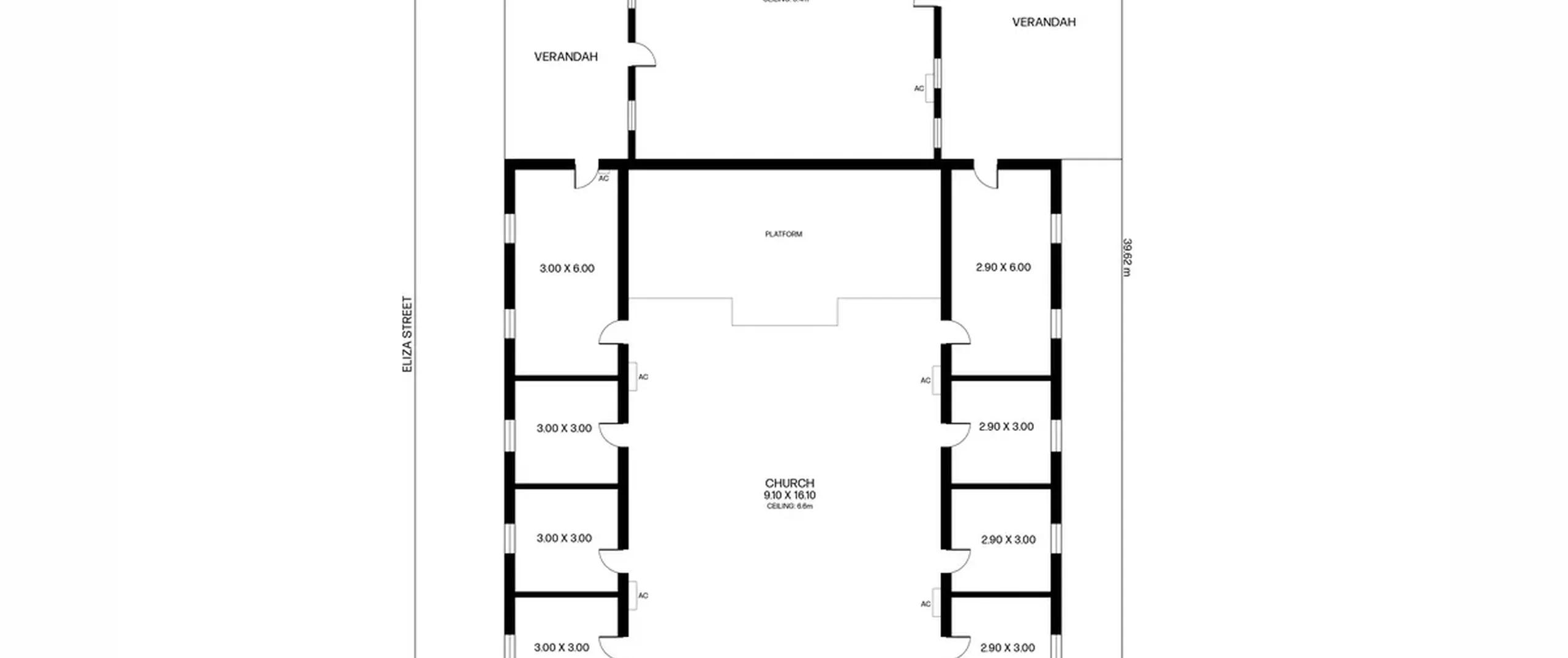 The church comprises a main hall, a service kitchen, and additional facilities including male and female toilets, along with a shed.