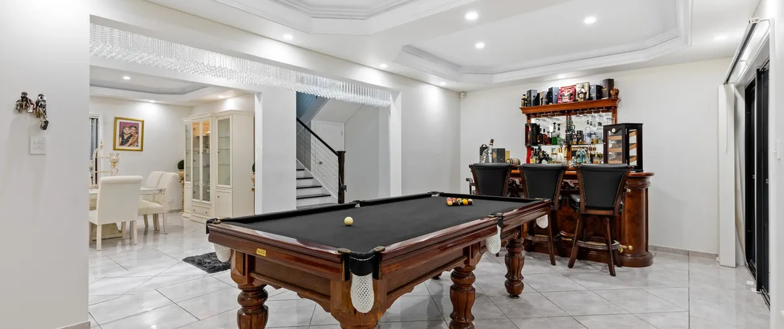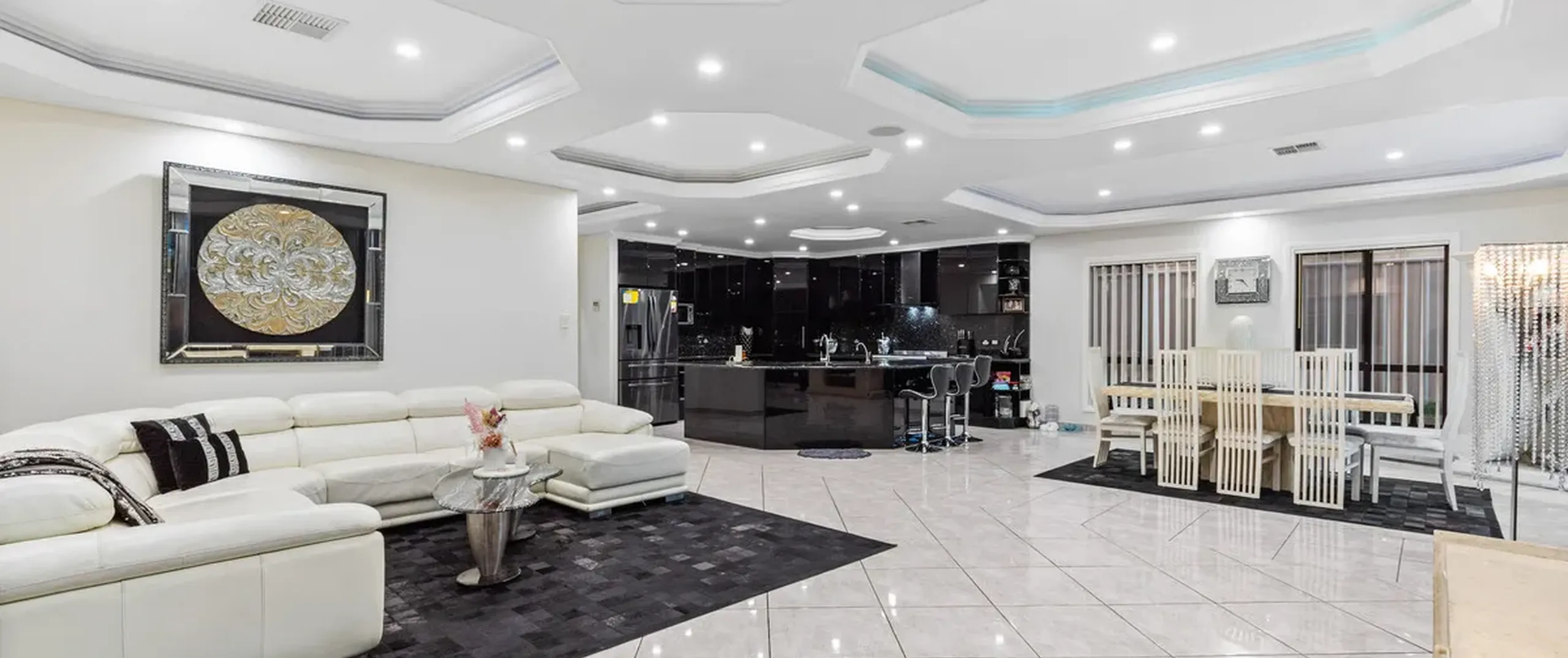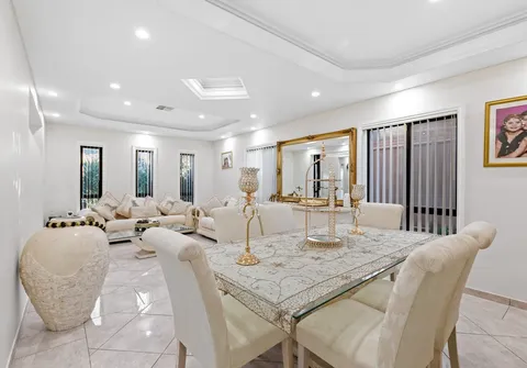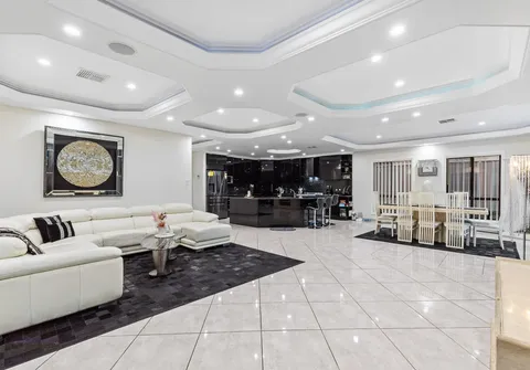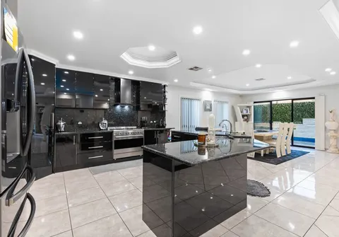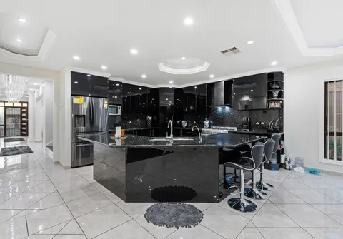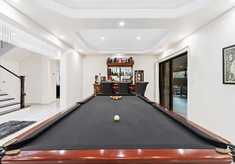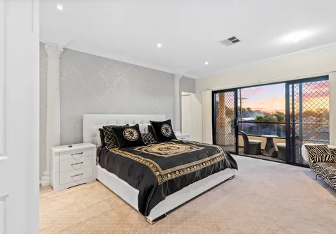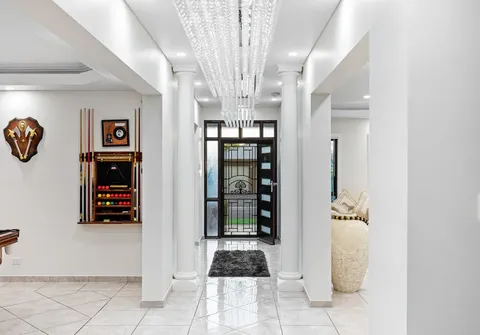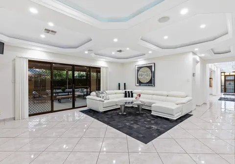 The entranceway sets an impressive tone for what is to come with a show-stopping chandelier and ornate coffered ceilings. Follow the gleaming porcelain tiles past the elegant formal lounge and dining and adjacent living room to an inviting open-plan family and dining area. The lavish kitchen will ensure that even the most dedicated cook feels right at home. Take pleasure in its quality appliances, high-end finishes, granite benchtops and desirable kitchen island.