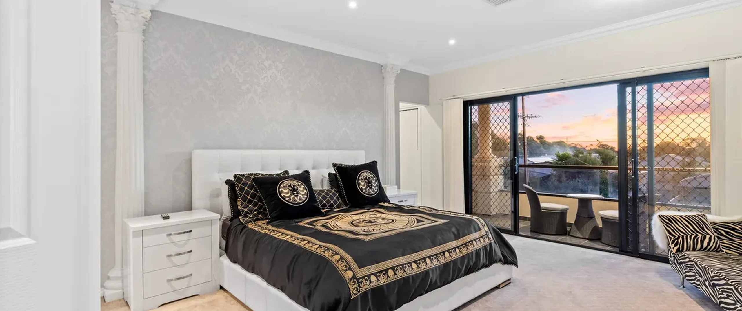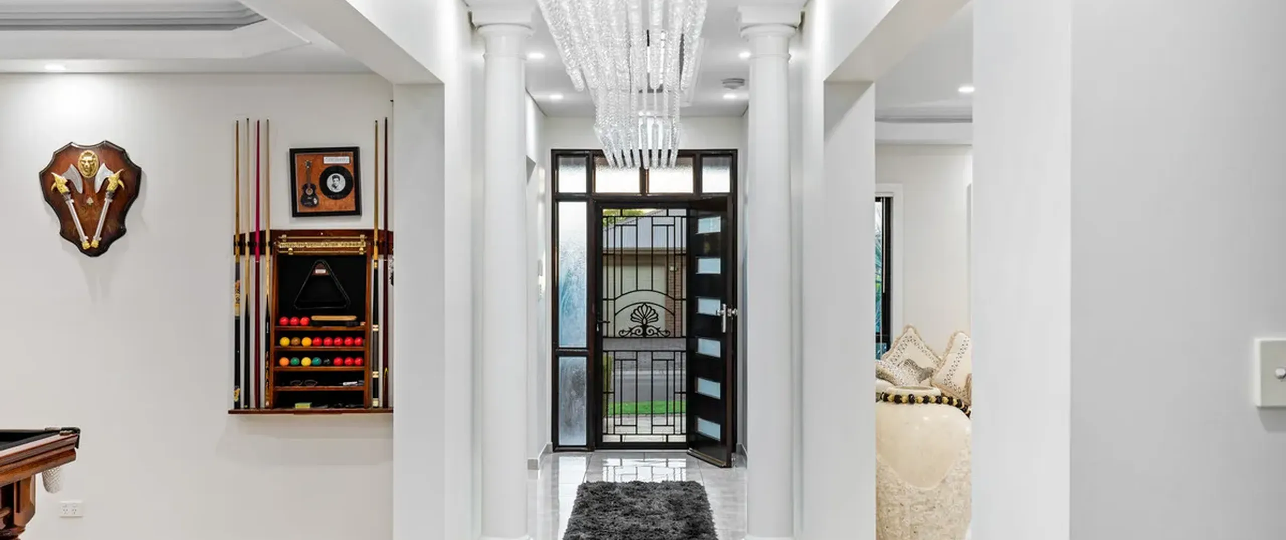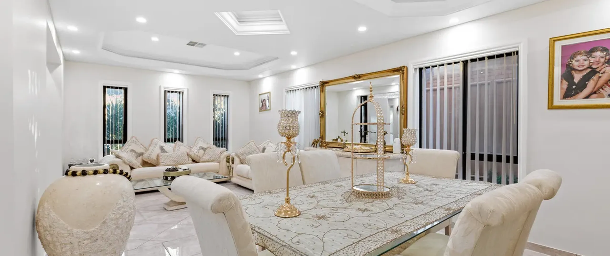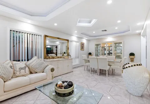 The entranceway sets an impressive tone for what is to come with a show-stopping chandelier and ornate coffered ceilings. Follow the gleaming porcelain tiles past the elegant formal lounge and dining and adjacent living room to an inviting open-plan family and dining area. The lavish kitchen will ensure that even the most dedicated cook feels right at home. Take pleasure in its quality appliances, high-end finishes, granite benchtops and desirable kitchen island.