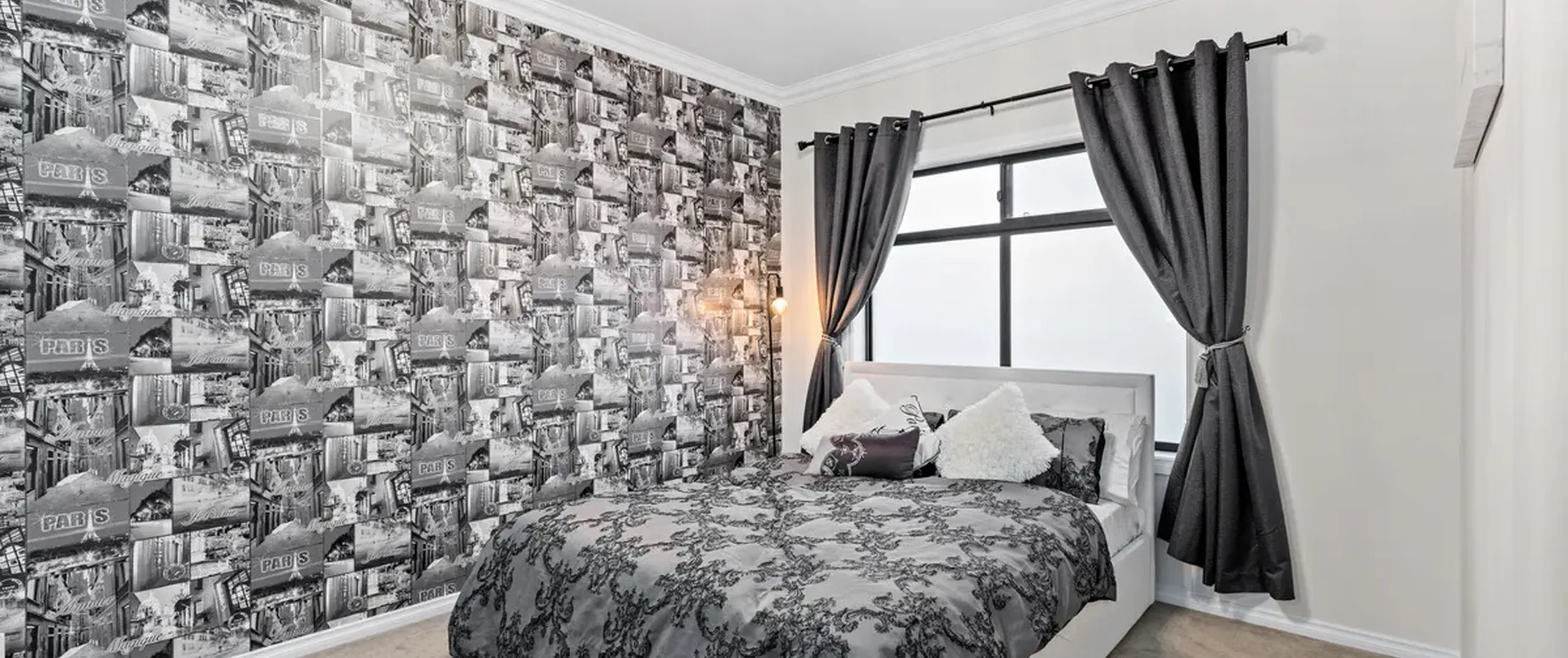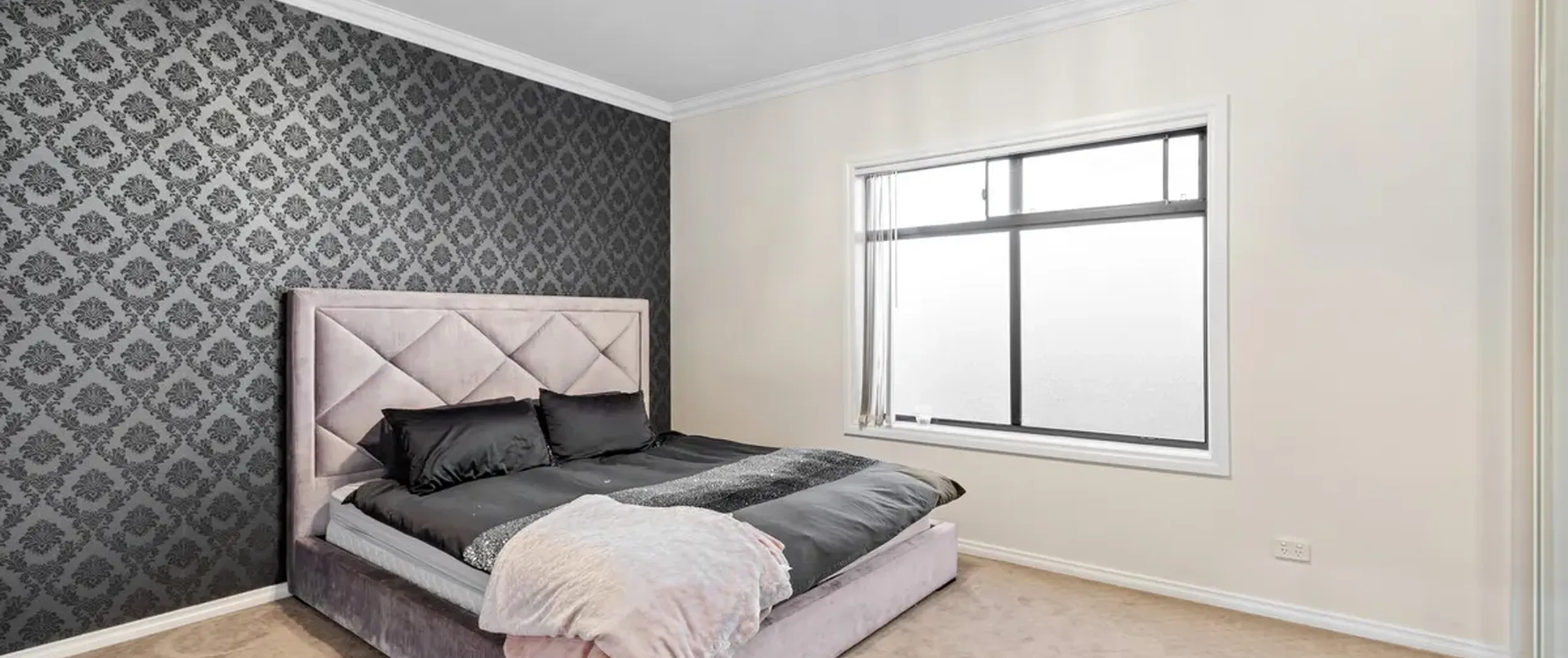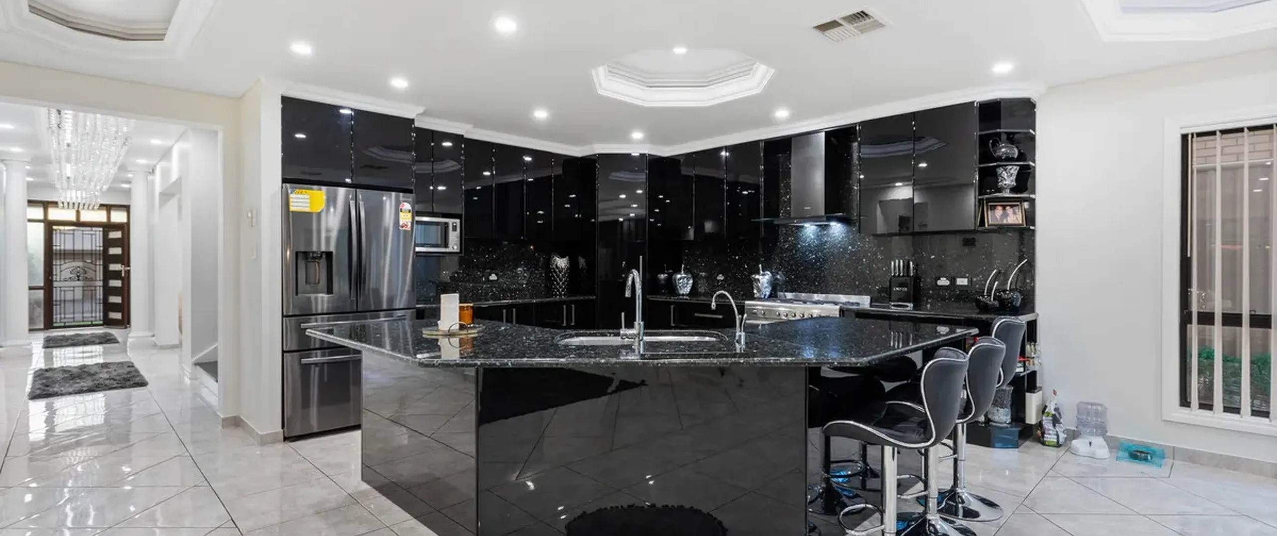 - Sleek black kitchen with granite benchtops and splashback, breakfast bar, dishwasher, ample cupboard space, quality 900mm stainless steel appliances and large pantry