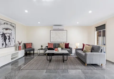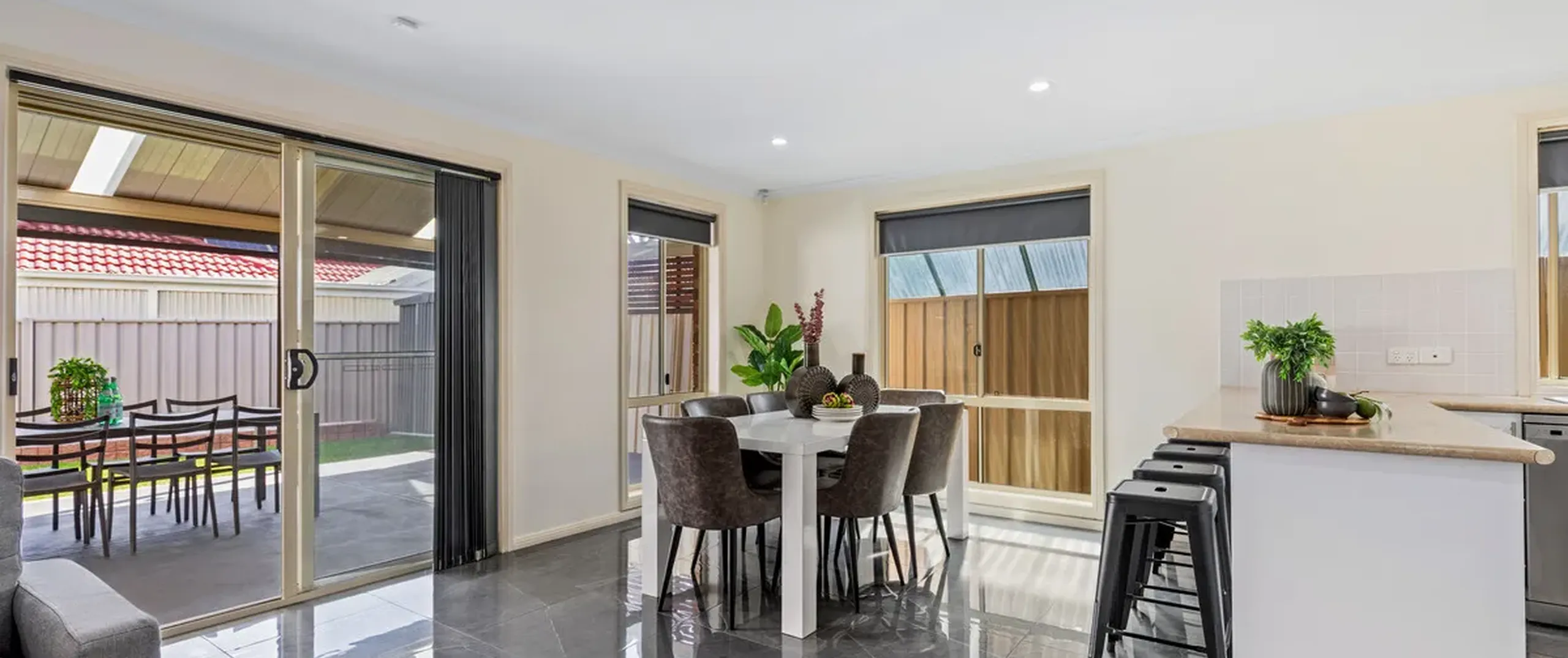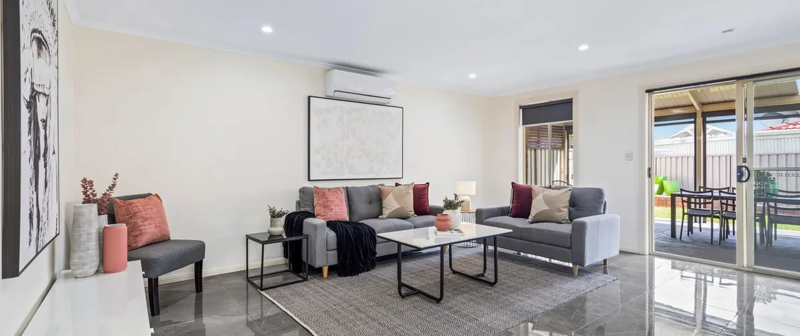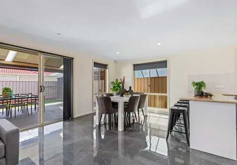 - Light-filled open plan, living, dining and kitchen with on-trend tiled flooring, split-system air-conditioner and sliding doors opening to outdoor area