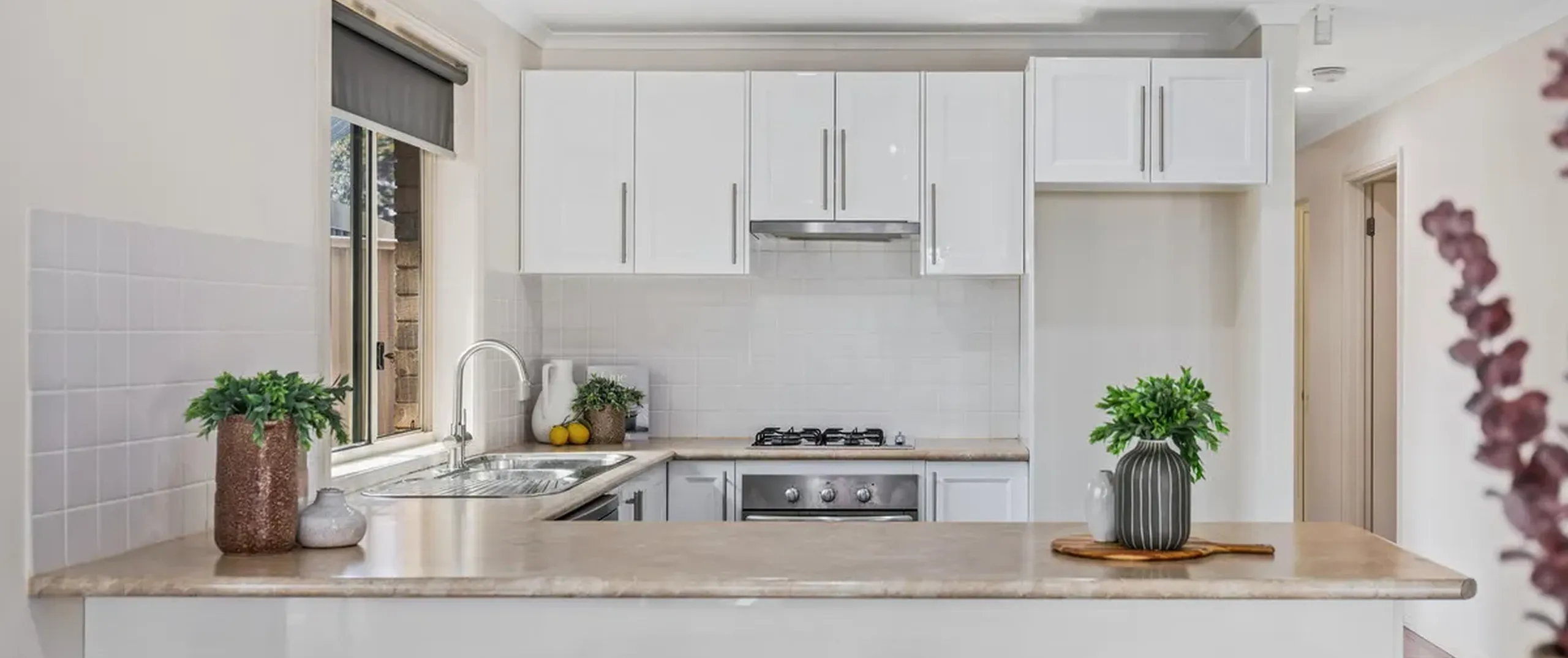 - Timeless kitchen with gas cooktop, stainless steel appliances including a dishwasher, ample cupboard space and sweeping benchtops with breakfast bar