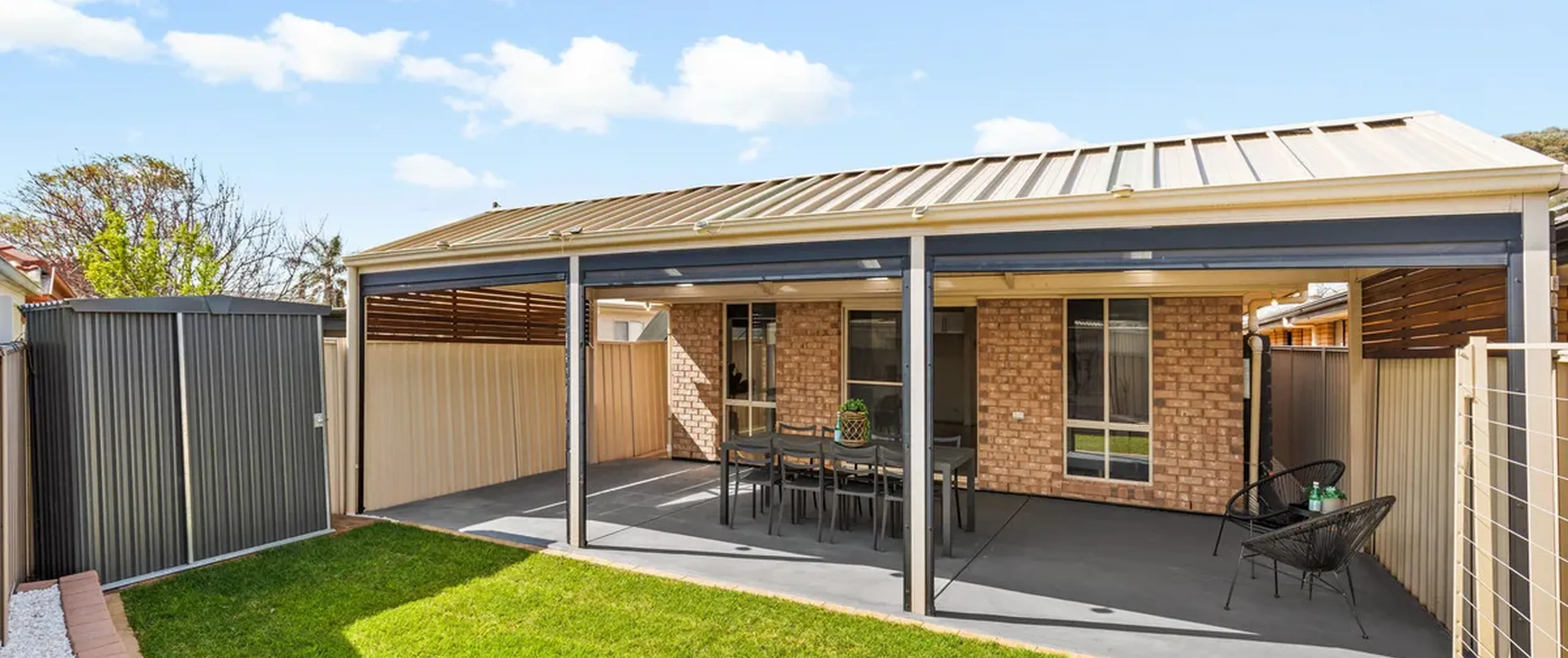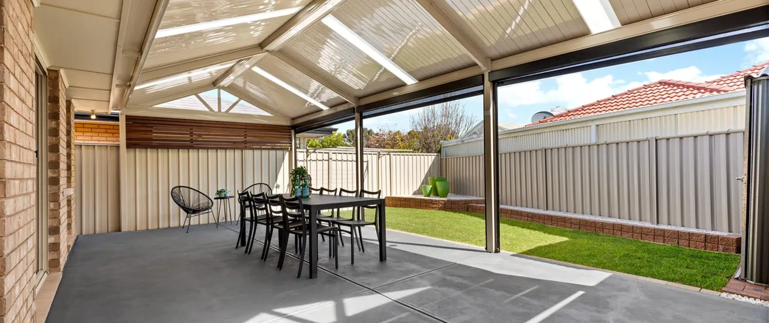 - Impressive outdoor entertaining area with pitched roof pergola and café blinds, making this a perfect space to entertain family and friends all year round